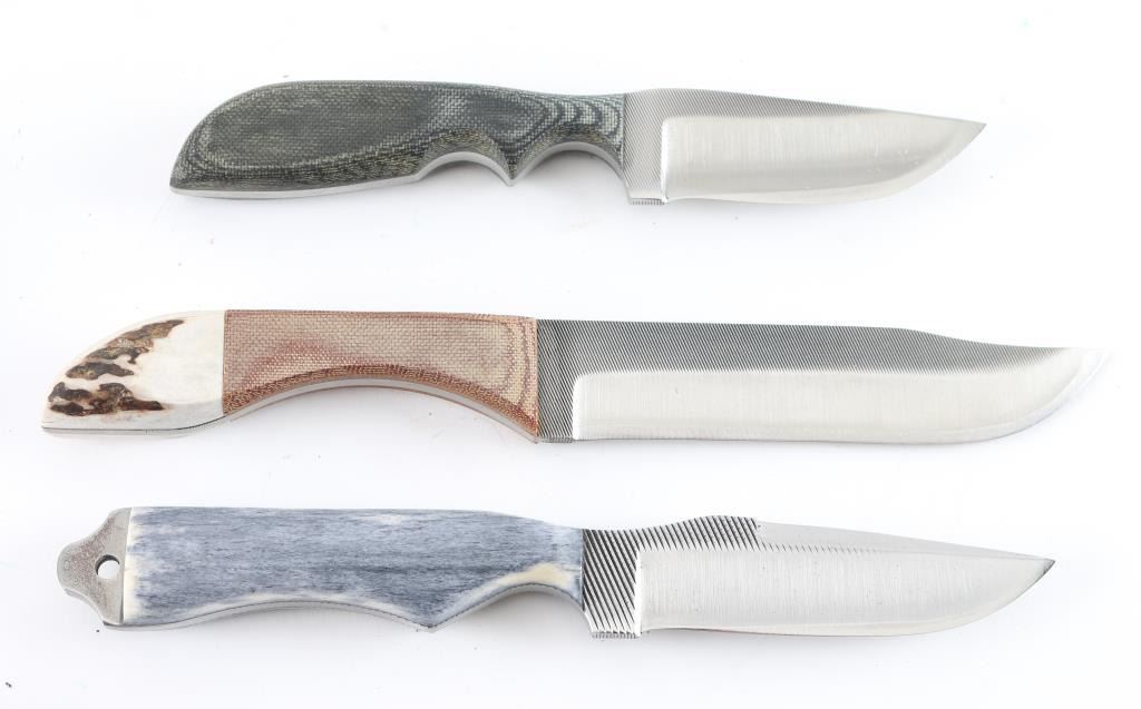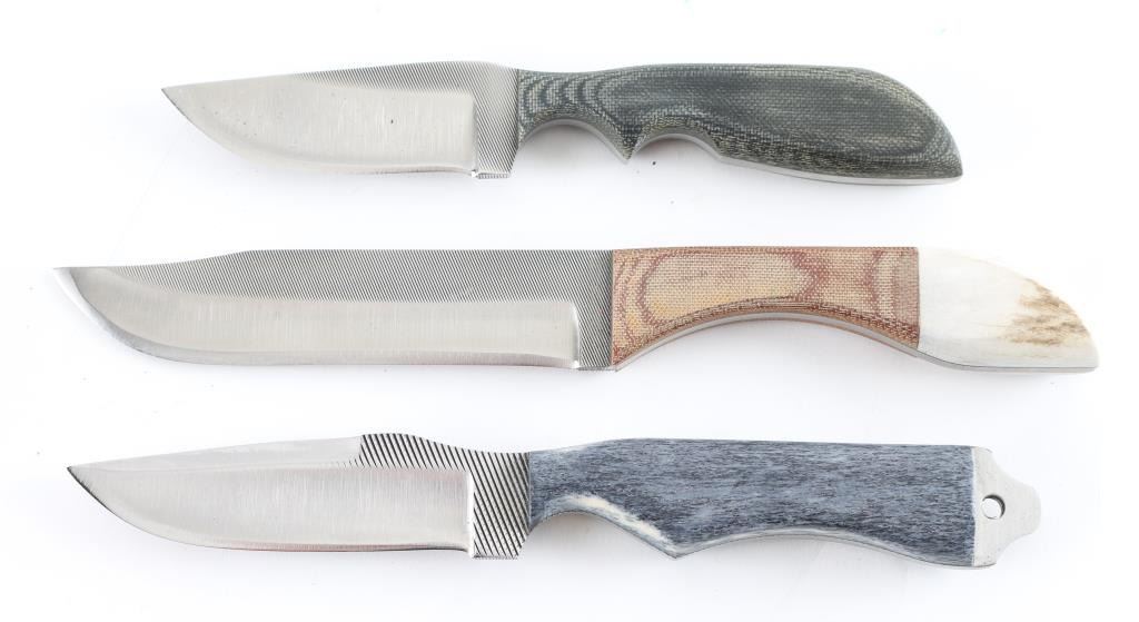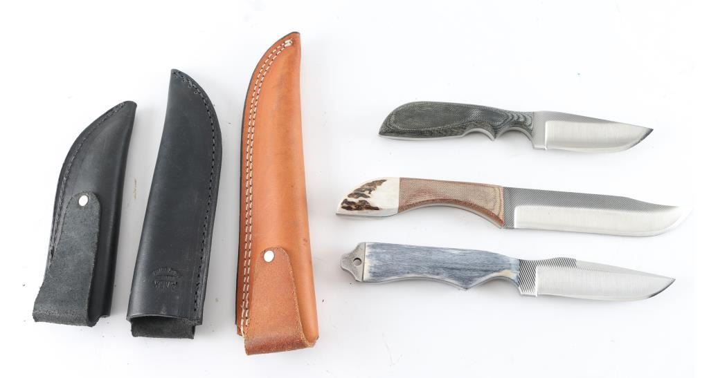 (1) Anza Two-tone handle with straight blade 10"overall with 6" blade (1)Anza blue dyed bone handle 9"overall with a 4" blade (1)Anza small knife 8"overall with 3"blade All three with leather sheaths