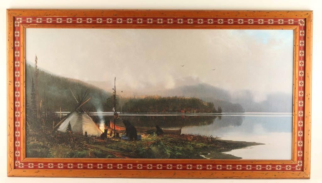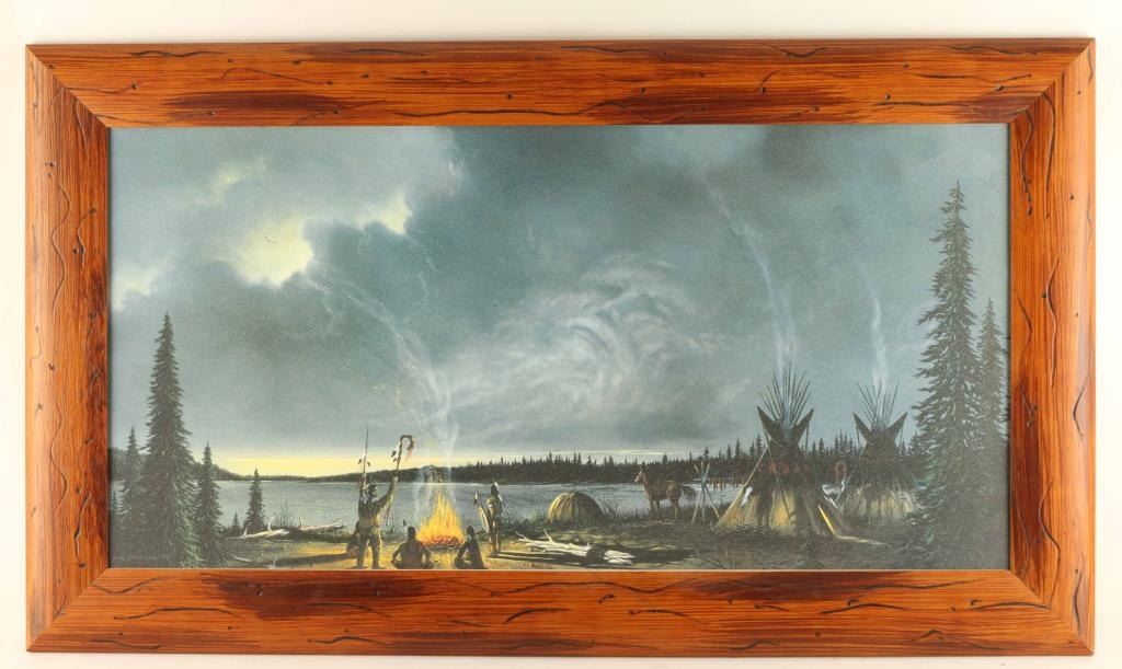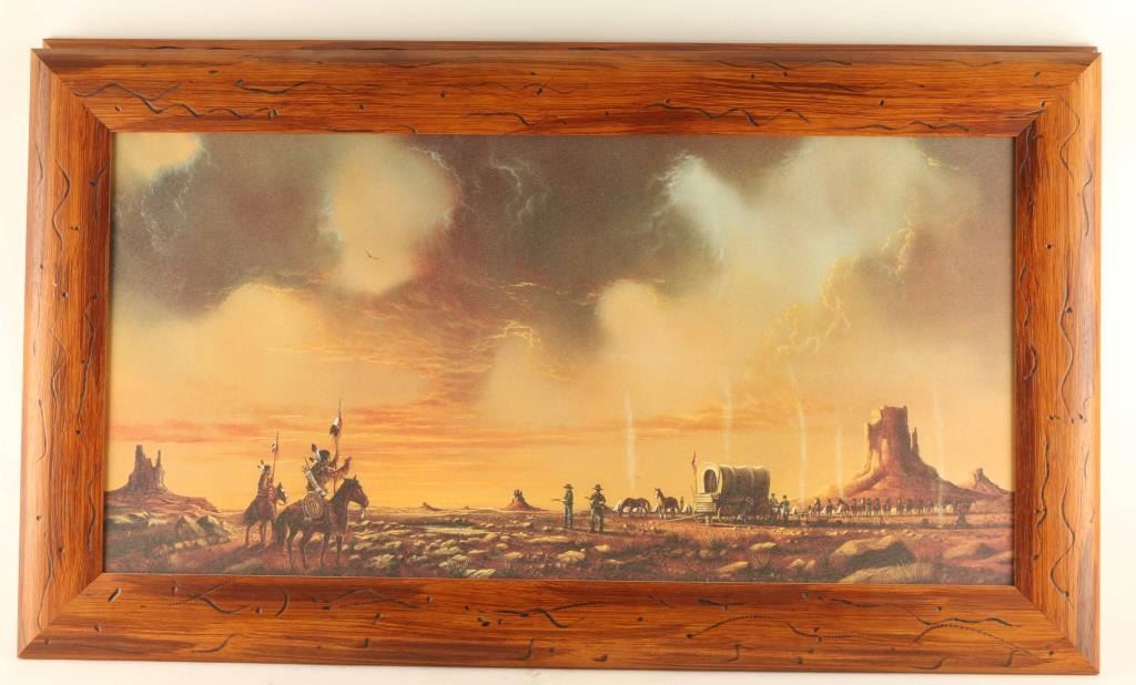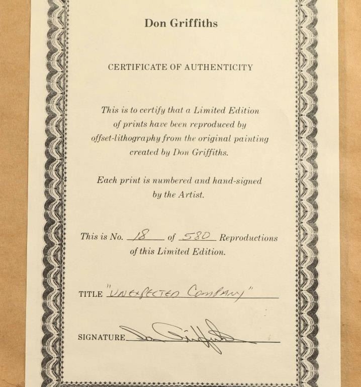 Includes (2) prints by Don Griffiths, (1) entitled "Unexpected Company" depicting cowboys and Indians having a stare down in a western landscape, (1) entitled "Wa Ta Tonka" depicting a Native American Campsite by the river. Both are #18/580 for their respective runs and share the same image size of 31" by 15 1/2" and are signed in the lower left hand corner. Lot also includes (1) Print of "Visitors of the North Fork" by Michael Coleman, depicts bears rummaging through a campsite, signature in the lower left corner, double framed with an image size of 17" x 35 1/2".