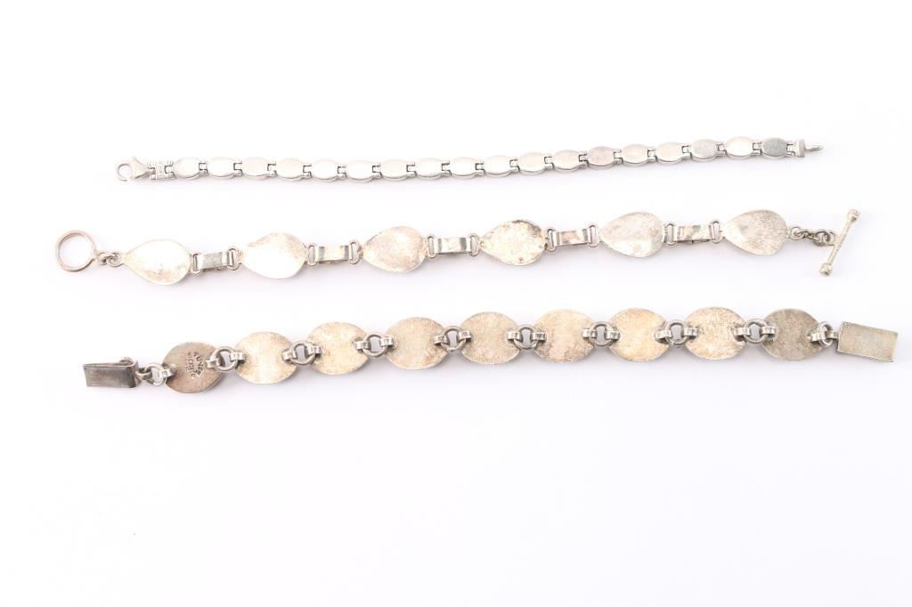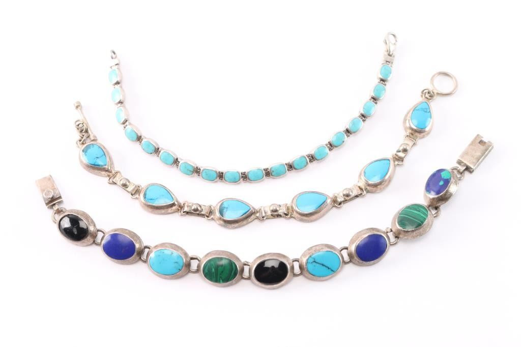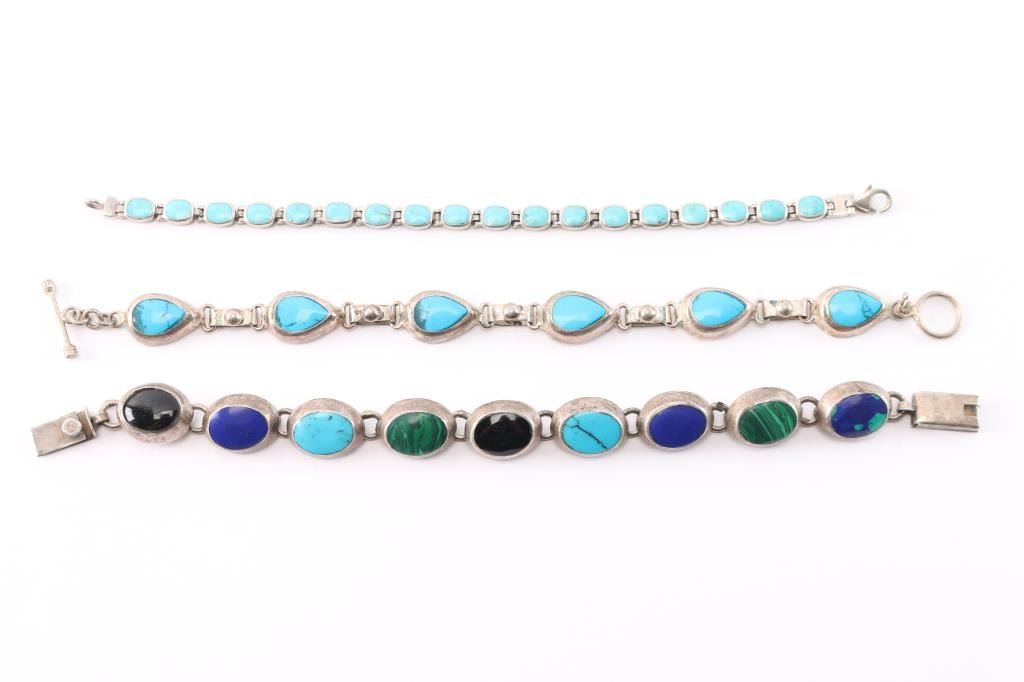 One is a sterling silver bracelet with matching turquoise stones, measures approximately 7" long. The other two are from Mexico, one is turquoise set in silver measuring approximately 7" long and the other is turquoise, malachite, lapis, onyx stones set in silver, measuring 3 1/2" long.