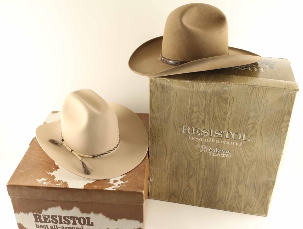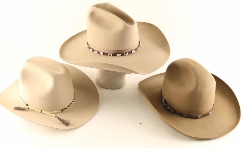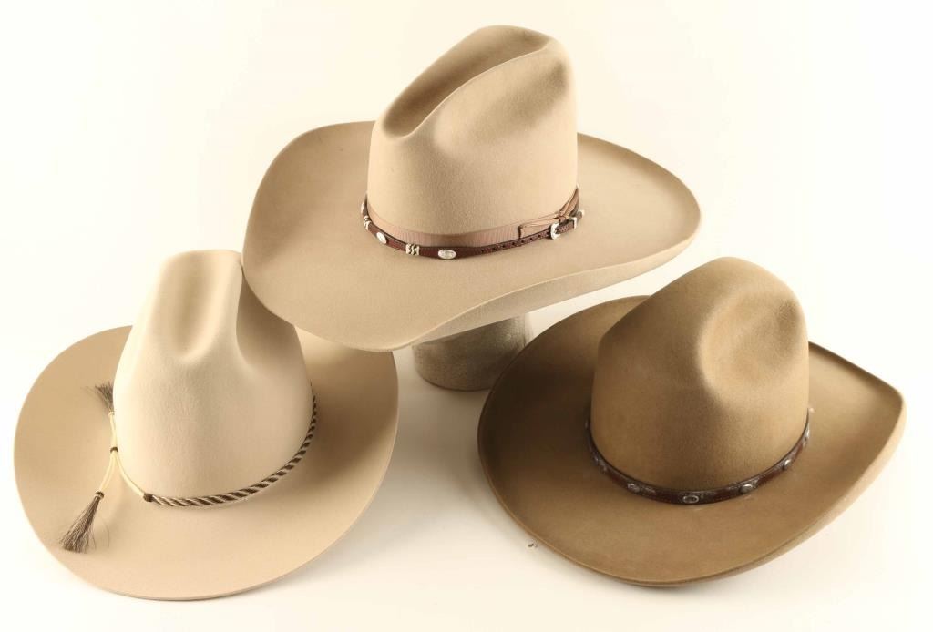 (1) Deluxe Reistol silverbelly cowboy hat size 7 3/8" (1) Deluxe Reistol tan cowboy hat size 7 3/8" (1) Deluxe Tonto Rim tan Gus Style hat 7 3/8" with custom hat band