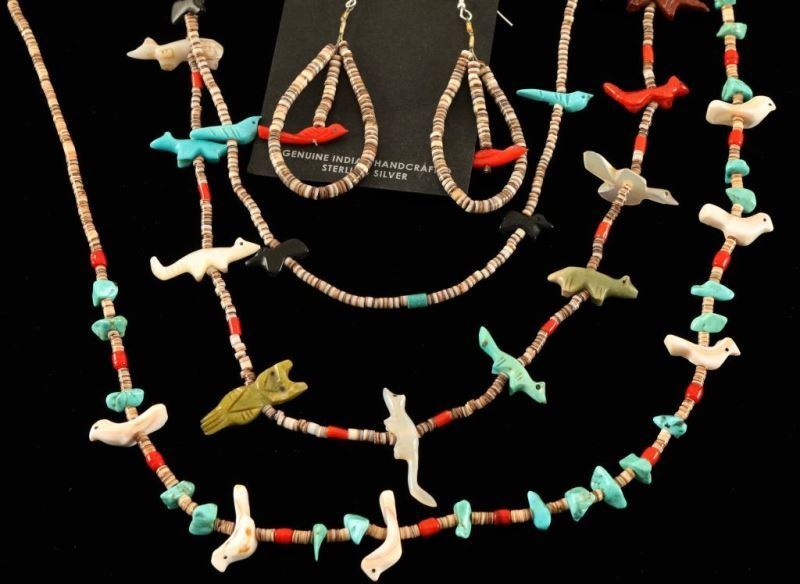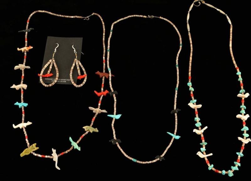3 necklaces with stone animal fetishes in various stones; turquoise, onyx, mother of pearl, coral and others alternating with heishi stones. Includes pair of heishi loops that have a coral bird in the center.
