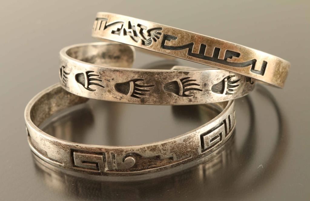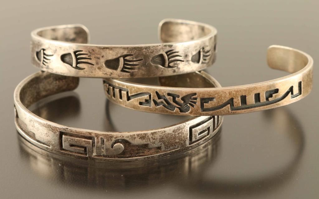 All three sterling with geometric designs.