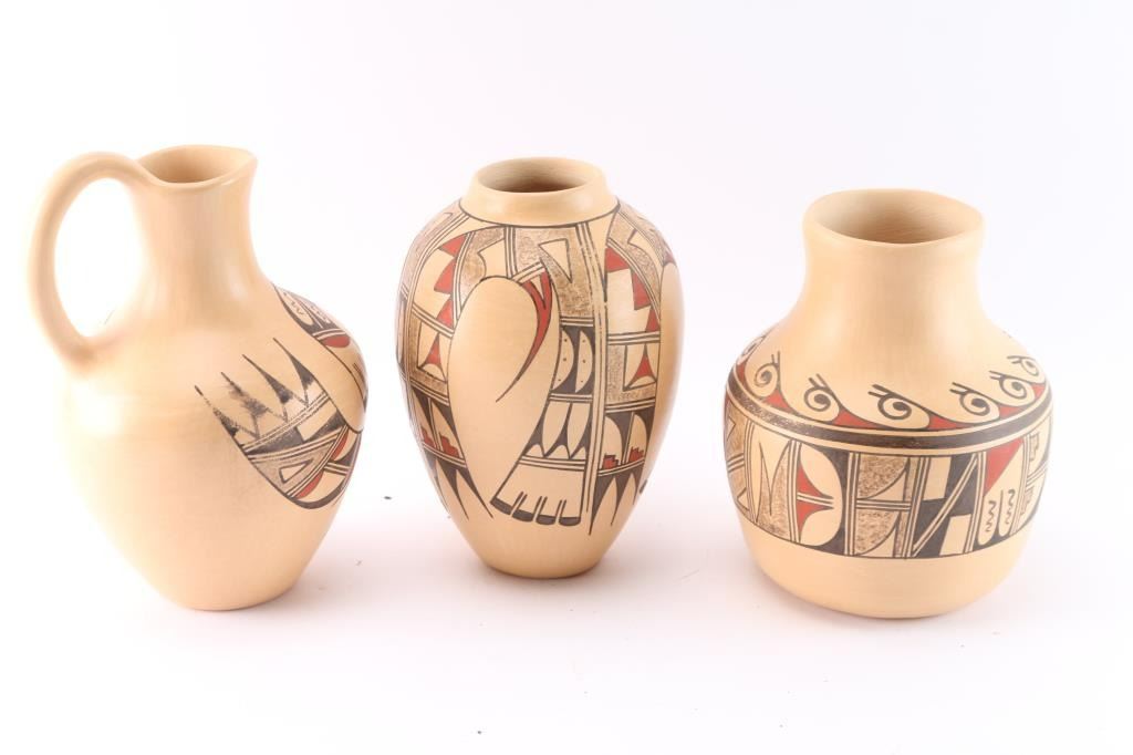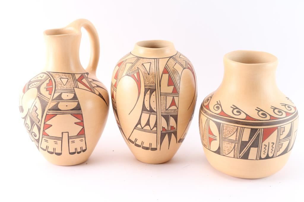 Made by Jofern Puffer. (1) Pitcher, 10" x 5". (1) Vase 8" x 7". (1) Vase 8" x 5".