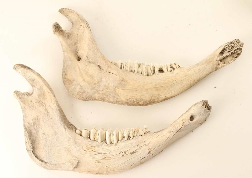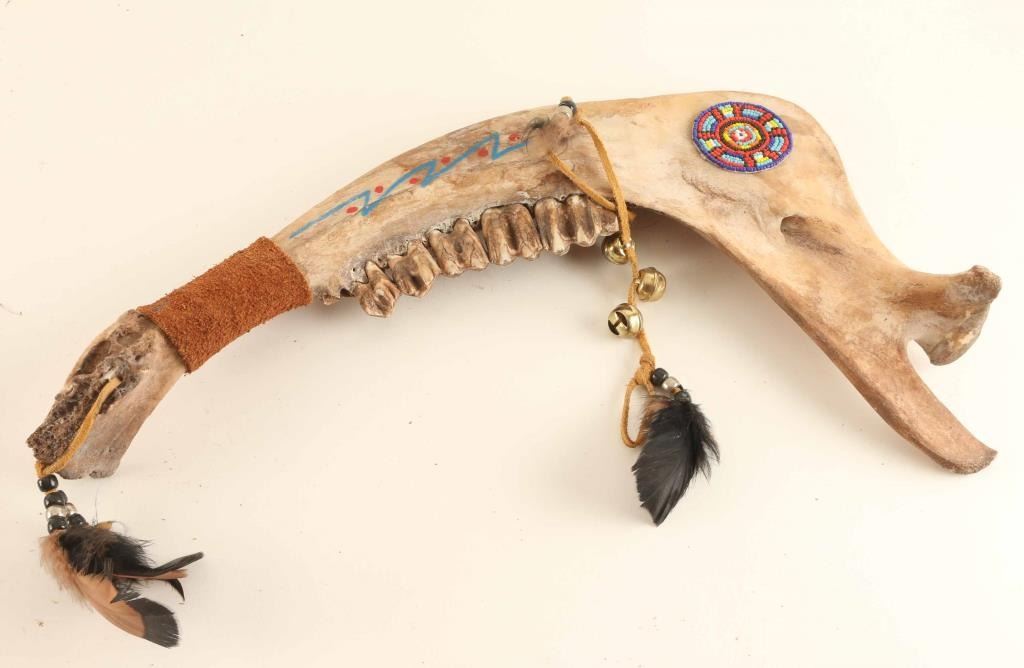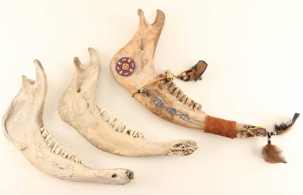 Includes (1) beautifully decorated jawbone with well done beadwork, painted, bells, and feathers, and (2) non decorated jawbones.