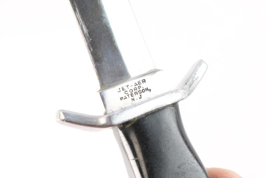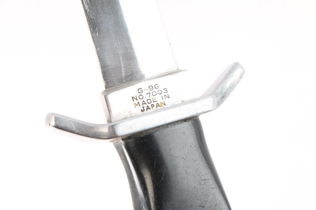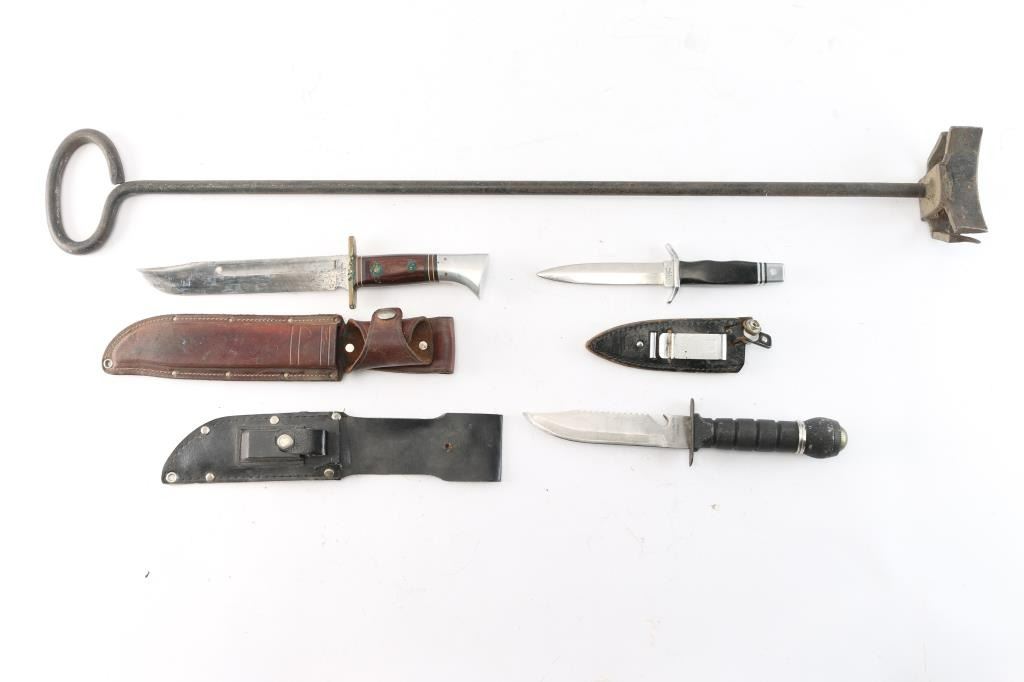 (1) Large fixed blade knife with wood handle and brass guard and pins. Stamped "Western USA". 7-1/4" blade, 12-1/2" overall. Comes with leather sheath. Survival knife with compass in pommel and fishing line, hook and more inside of handle. 5" blade, 11-1/4 overall. Synthetic sheath with sharpening stone. (1) G-96 Dagger with black handle. 4-1/2" blade, 8-3/4" overall. Made in Japan. Comes with leather sheath and belt clip. (1) Iron brand measuring 33" x 5".