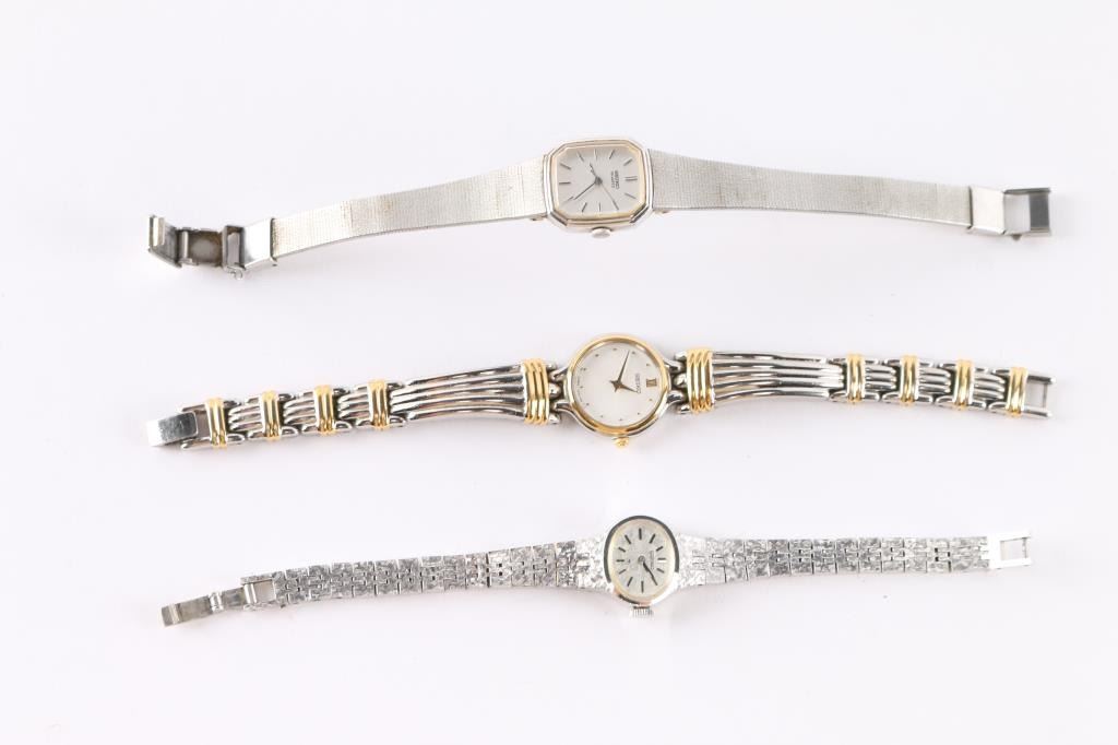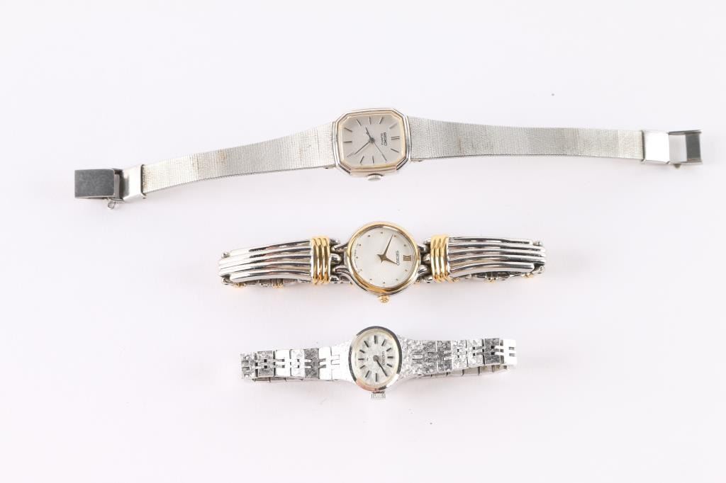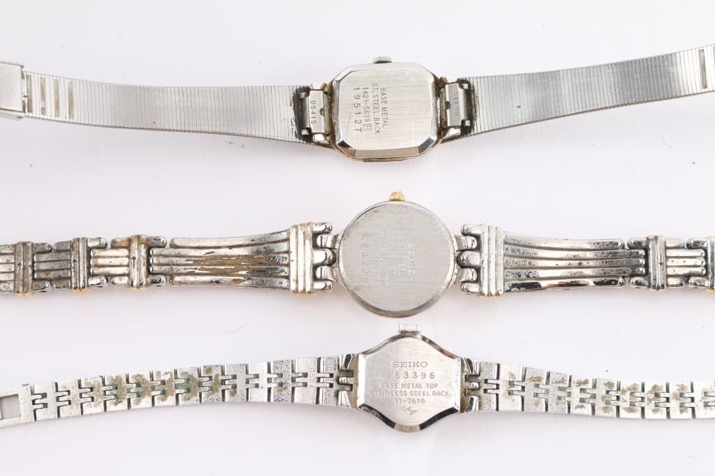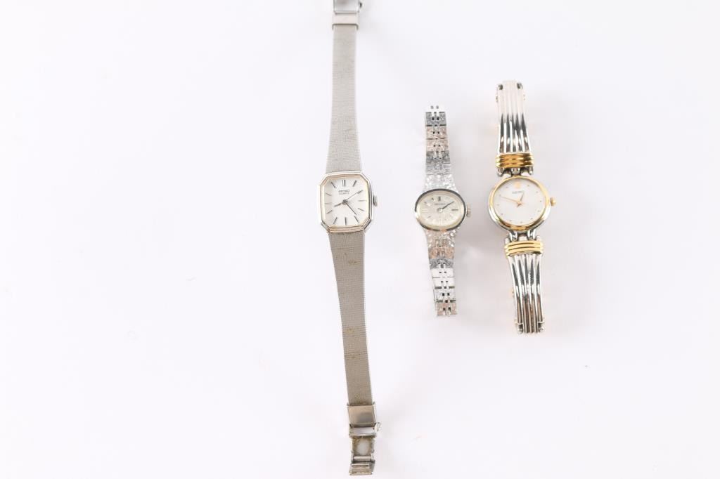 1 Seiko Quartz and 2 Seiko watches. 2 are silver tone and 1 is silver and gold tone. Not running.