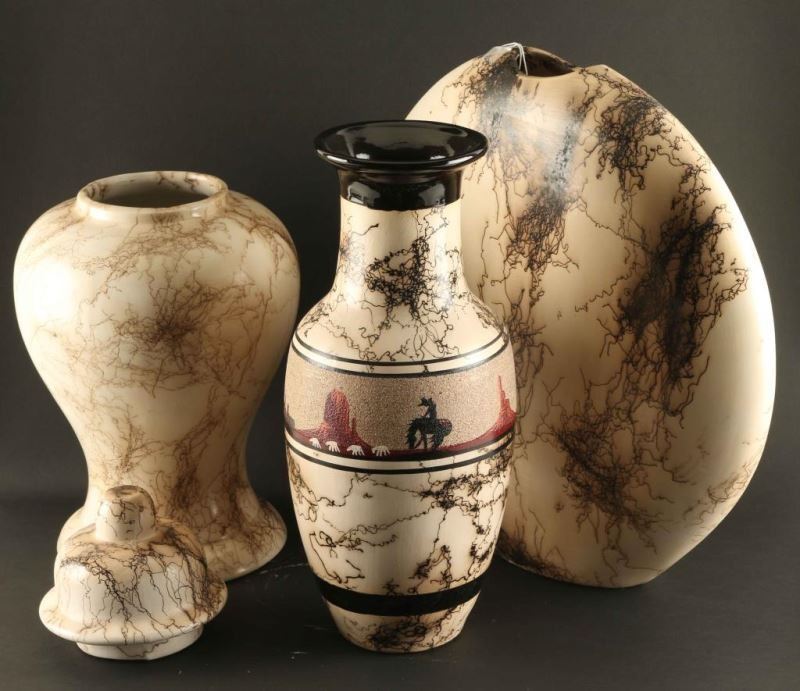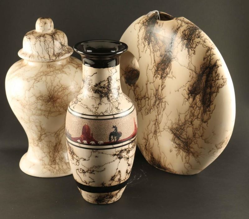 (1) Vase with figures and animals in desert scene. Measures 13 3/4"x4 1/2". (1) Round pot with open circle to the side with incised carved design and turquoise stone measures 14 3/4"x 14 3/4"x2 1/2".(1 ) Urn style with lid measures 14 1/2"x7" signed 'S Smith'.