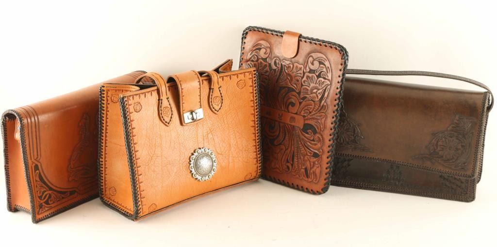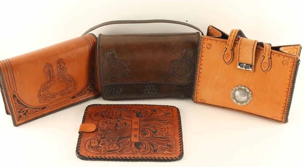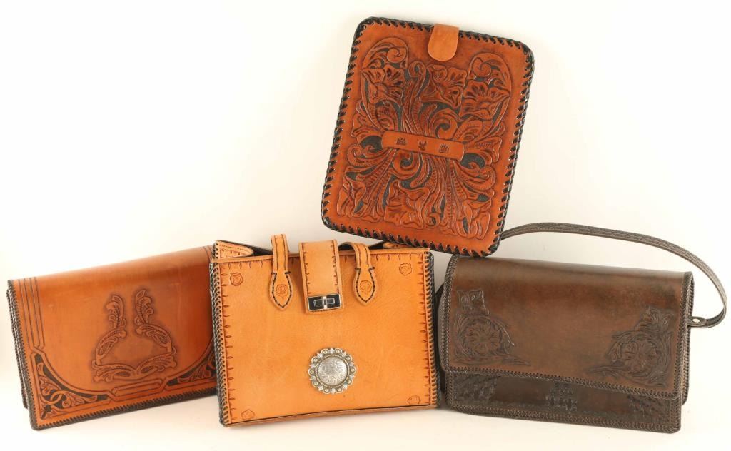 Includes (2) Shoulder purses, and (1) lined market hand bag .From Arizona Leathersmith Bill Myers, all genuine leather. Lot also includes (1) large tablet case.