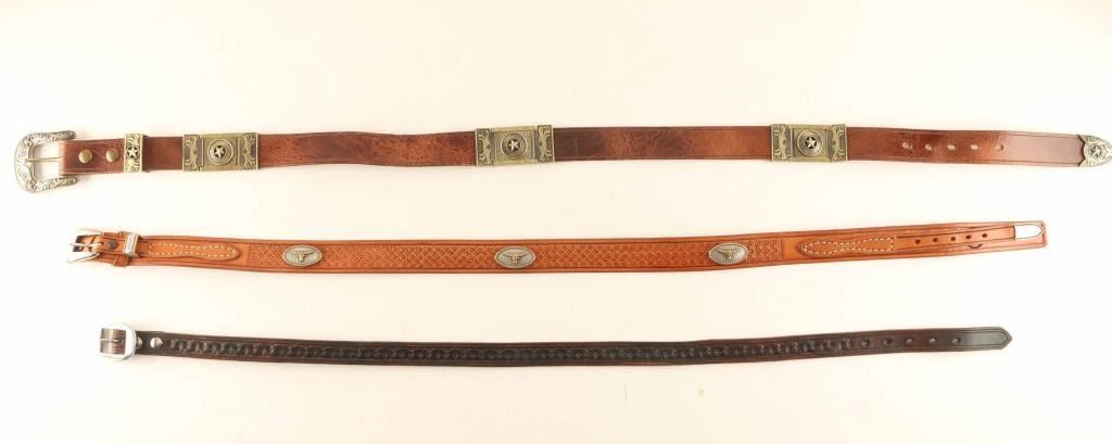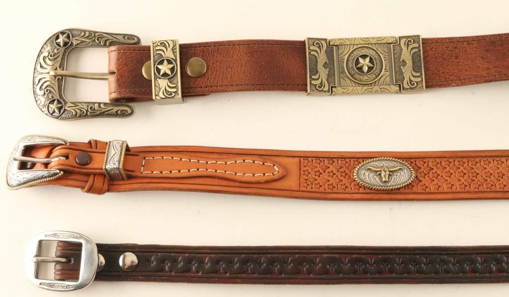 Includes (1) 38" waist belt with longhorn conchos and stamped star design, (1) 40" waist 6 piece buckle set belt with star motif, and (1) 34" black leather belt with buckle. All items are genuine leather from Arizona leathersmith Bill Myers.