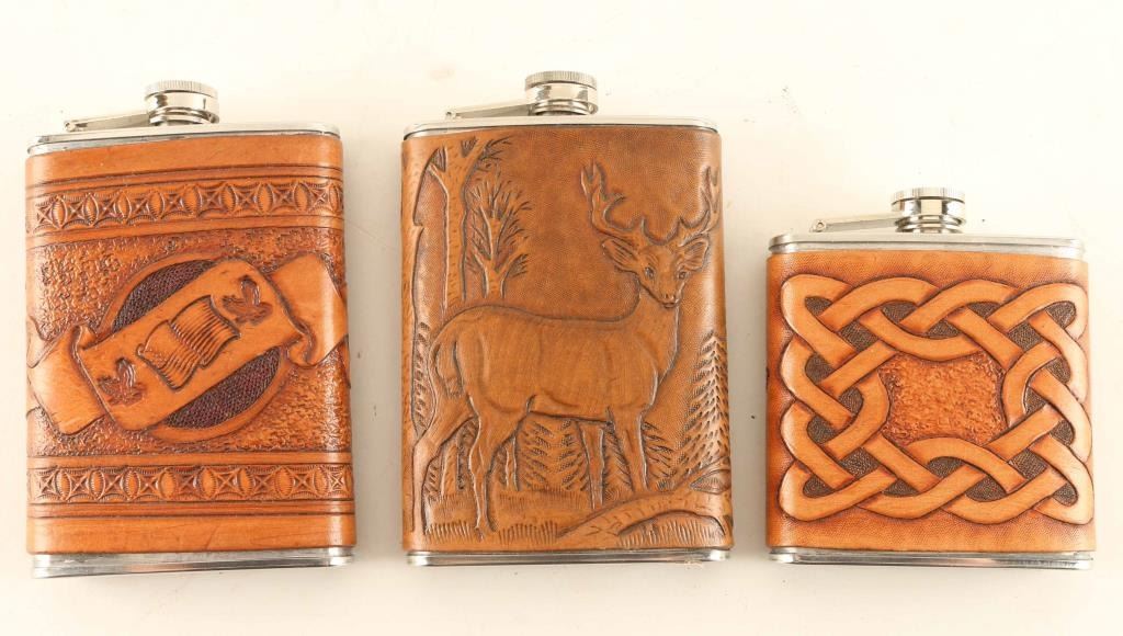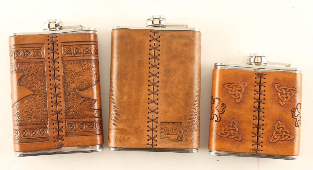 Includes (3) flasks all with different designs and sizes. From Arizona Leathersmith Bill Myers, all genuine leather.