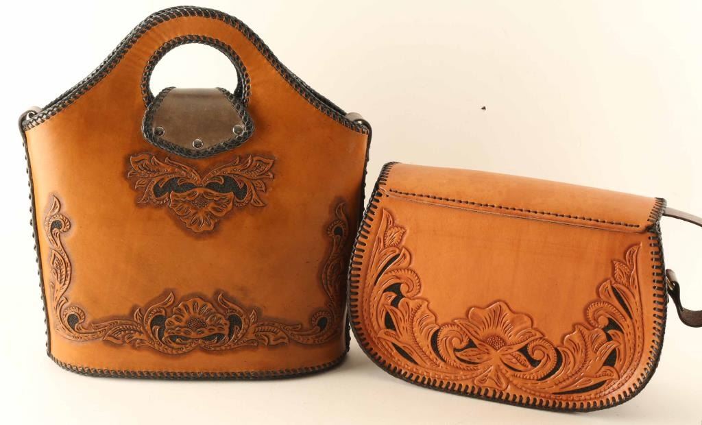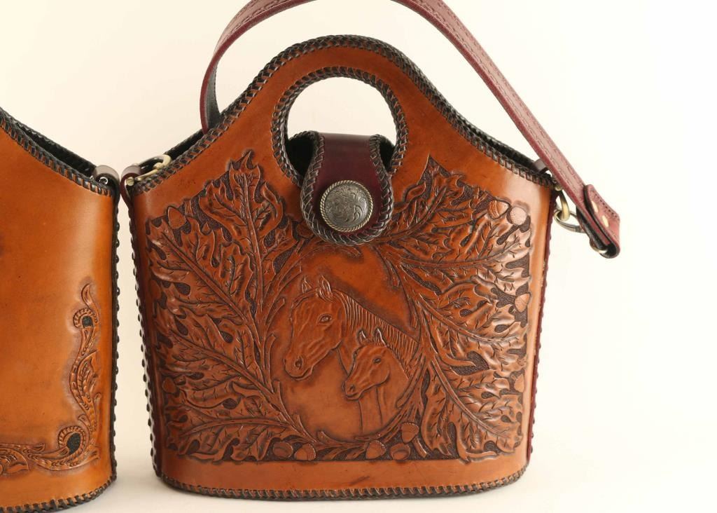 Includes (3) leather purses, all genuine leather from Arizona leathersmith Bill Myers. Two of the three have Bill Myers marking on the bottom. (1) Marketplace bag with a very conservative with a light flora motif design, (1) Marketplace bag a very loud leaf and acorn design with two horses in the center, and (1) shoulder purse.