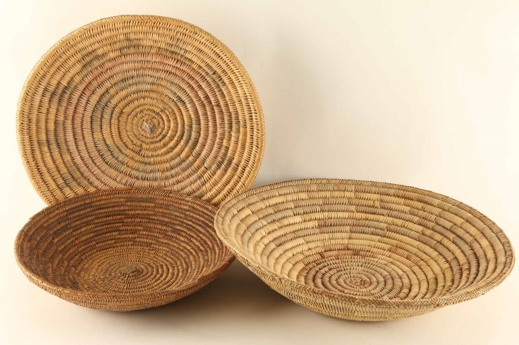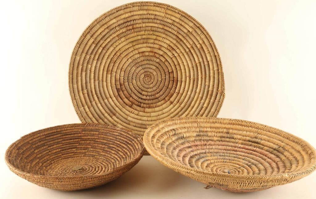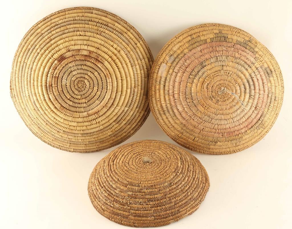 (1), Oldest Navajo Meal tray with heavy losses to rim;12" diameter. (1) With faded geometric design; 14" in diameter, (1) largest is a two tone design and is 15 1/2" in diameter.