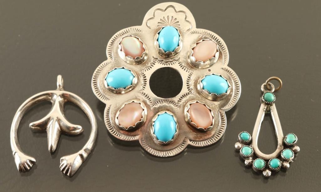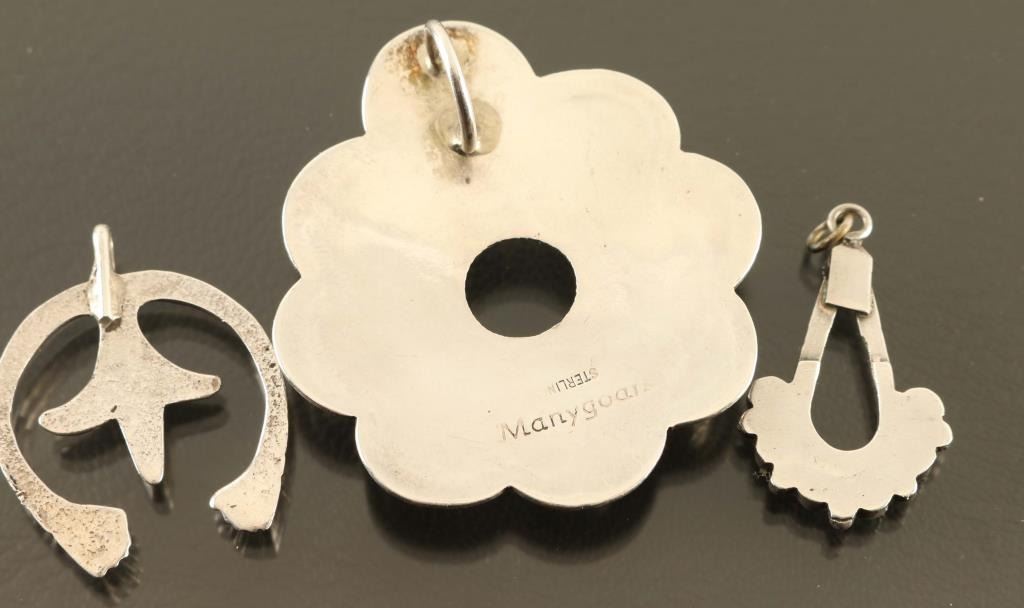 (1) Round rose quartz and turquoise pendant maker marked "Manygoats" (1) Sand cast sterling pendant (1) Small turquoise pendant