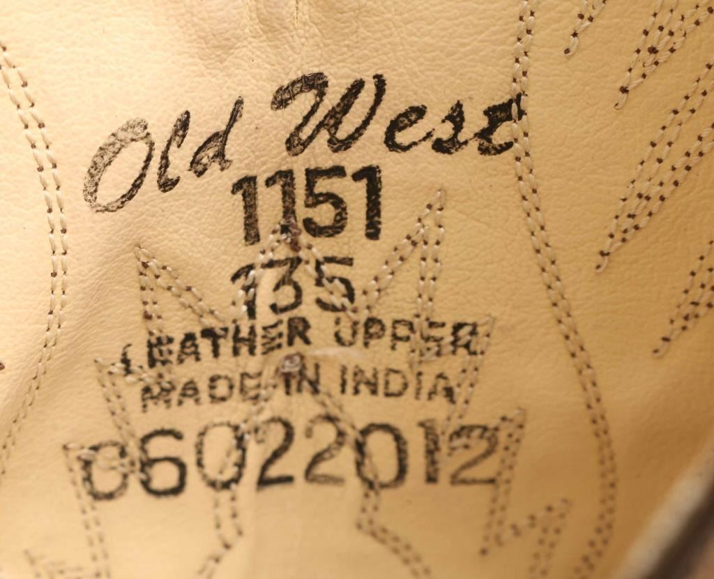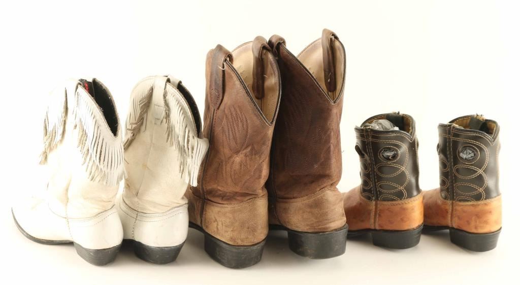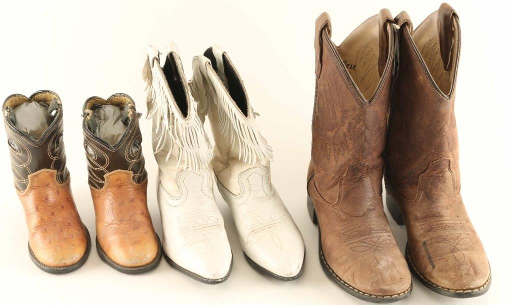 Lot includes (3) different pairs of boots including white leather, two-tone light brown leather and ostrich looking leather, and a light brown leather pair. In good condition.