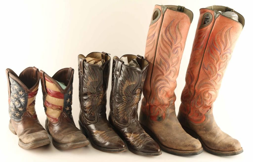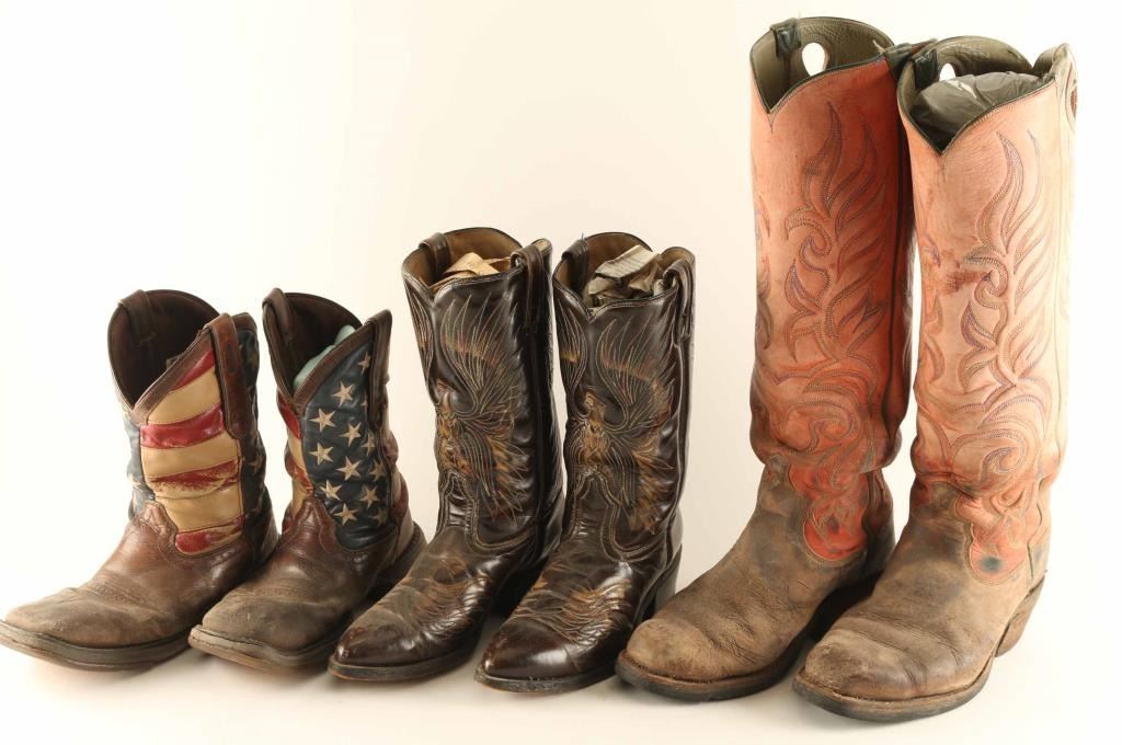 Includes (1) pair of brown leather boots with United States Flag design in okay condition, (1) pair of leather boots with a phoenix motif stitch work design in very good condition, and (1) pair of tall leather boots with a stitch work "fire" motif in good to fair condition.
