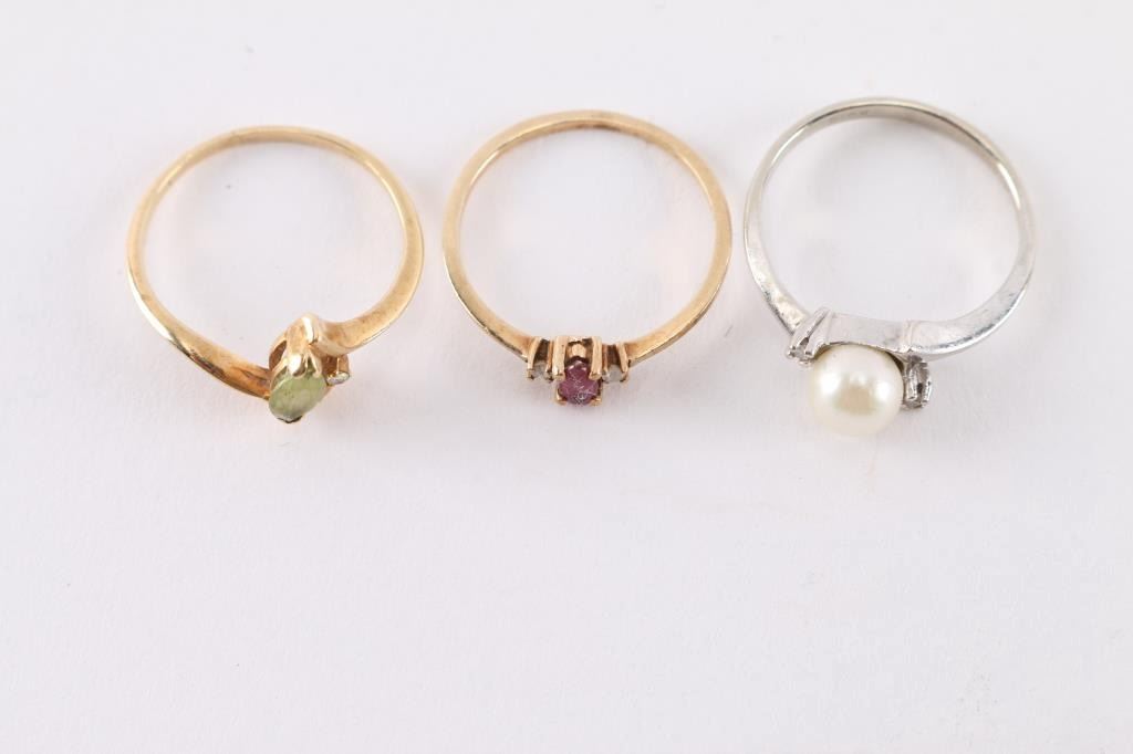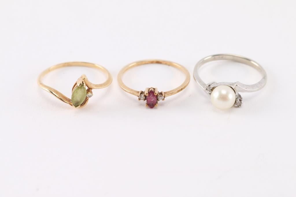 One is 10k white gold with pearl and 2 tiny diamonds on either side. One is 10k gold with small peridot stone and 1 tiny diamond on side. One 10k gold with pink spinel stone and 2 tiny diamonds on either side.