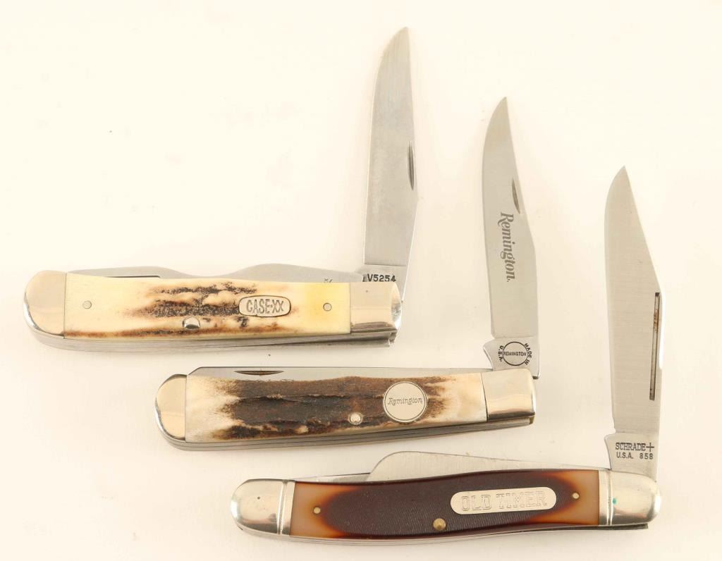 1 Remington knife blade marked 1994 Preferred Customer 1 of 2500, 1 Schrade Old Timer with leather holder and 1 Case XX knife and fork combo.
