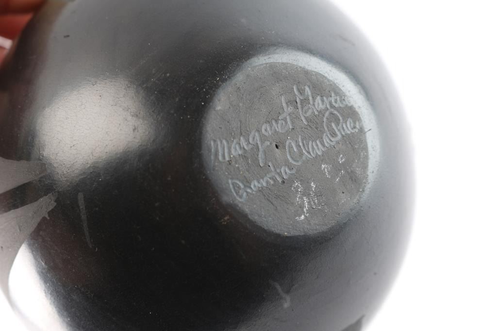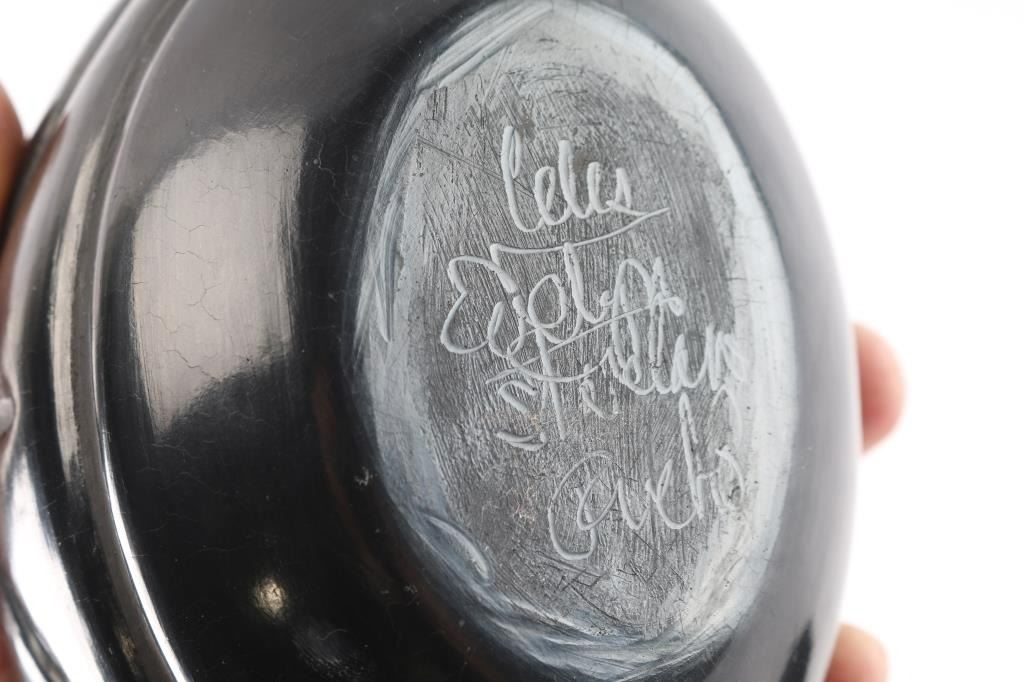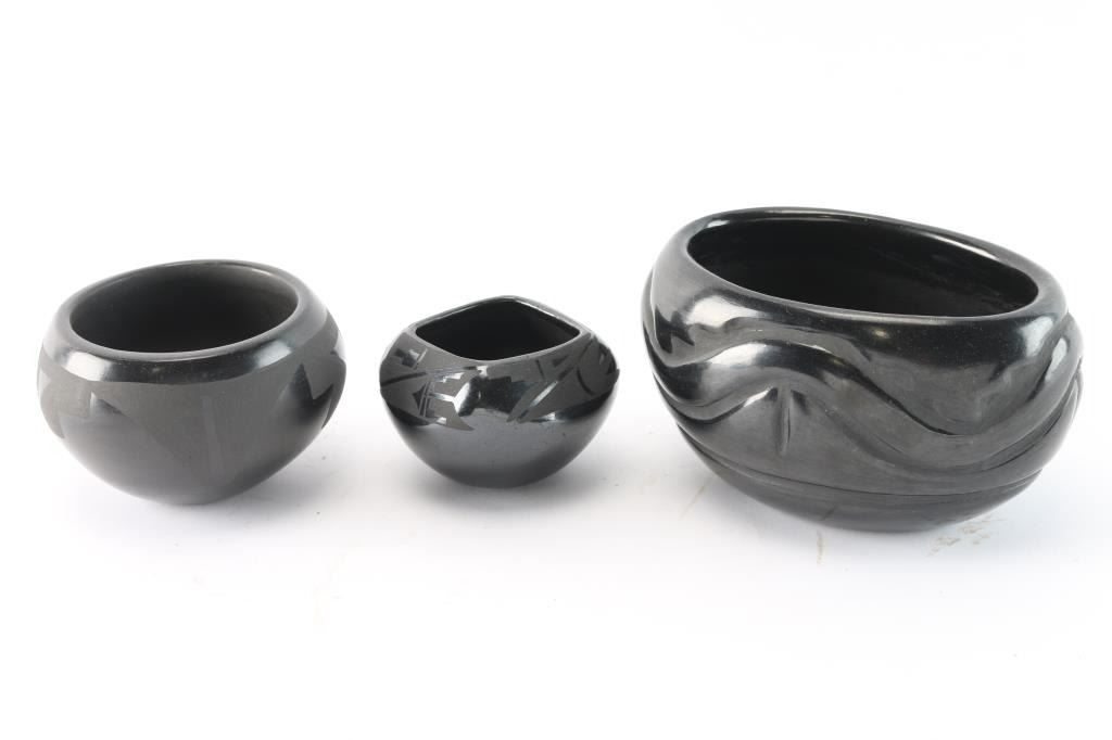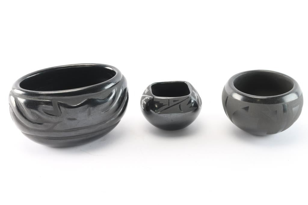 Beautiful incised oval pot measuring 5 1/2" wide and 3 1/4" tall. Round pot measuring 3 1/2" and 2 1/2" tall. And squared pot 2" tall and 3" around. All good condition and signed on bottom.