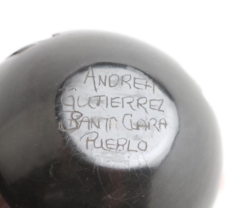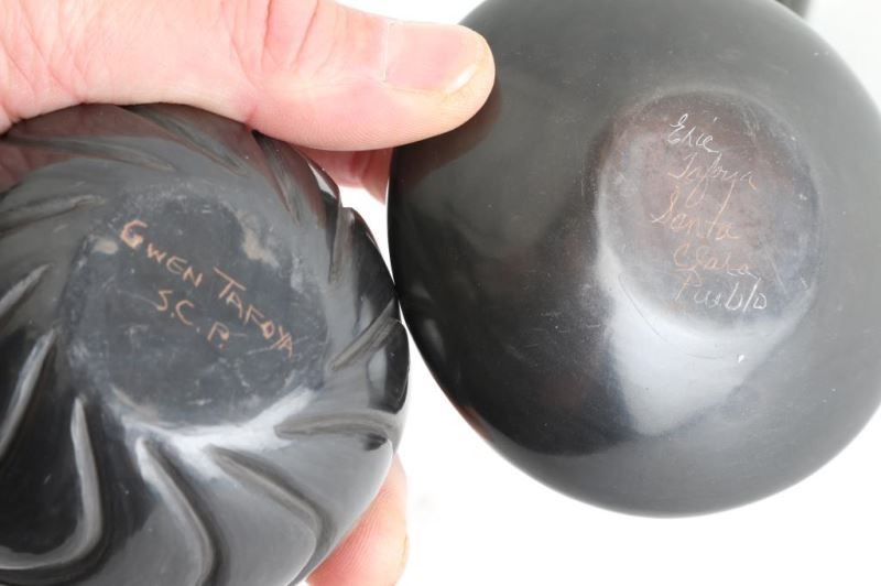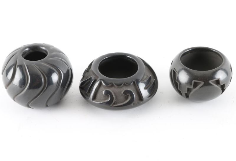 1) Inside carved mini blackware pot by Gwen Tafoya. Measures 3 inches 2) Inside carved blackware pot by Andrea Gutierrez. Measures 2 inches 3) Blackware pot done by Eric Tafoya. Measures 3.5 inches.