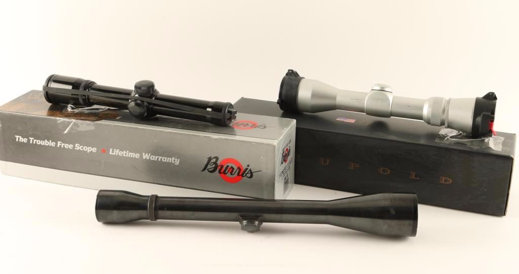 Weaver K6 60-B1 Scope and a Leupold Vari X 2.5-8x 32mm-extended eye relief in silver, appears to have been mounted on rifle at one time has surface scratches from the rings and aBurris Intermediate Eye 2.75x Plex Xer, Gun Sight Scout Scope With Crosshairs In Original Box.Relief