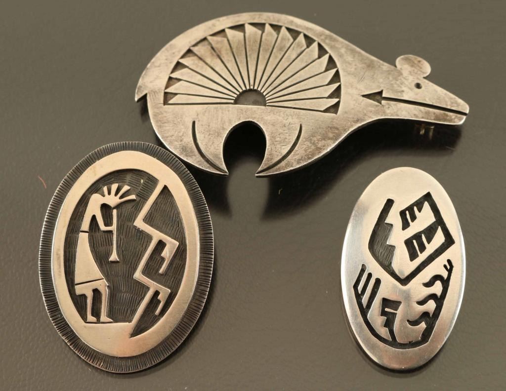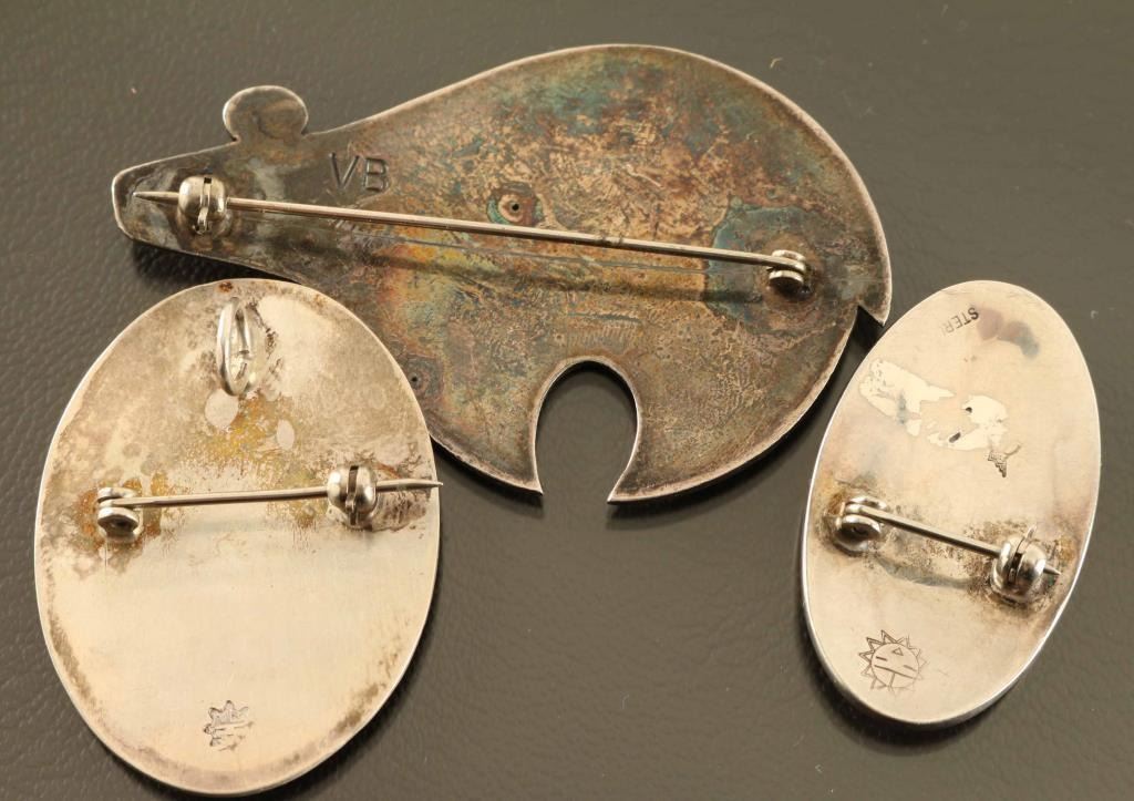 (1) Bear Effigy Pin marked "VB" (1) Kokopelli Pin/Pendant sunface hallmark (1) Maize / Geometric Pin