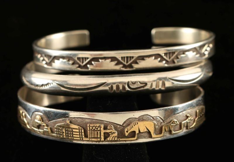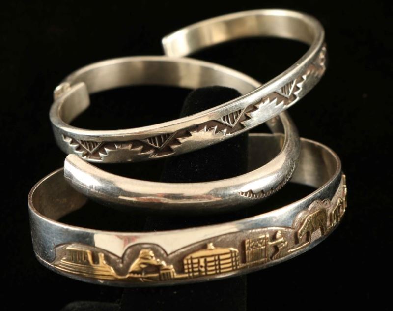 (1) Handmade with stamped stair step design. Marked 'Laner, Handmade' and 'Sterling'. (1) Storyteller with village, animals and figures at work. Marked 'KK' and 'Sterling'. (1) Stamped with bear and scallop design. Marked with a feather and 'Sterling'.