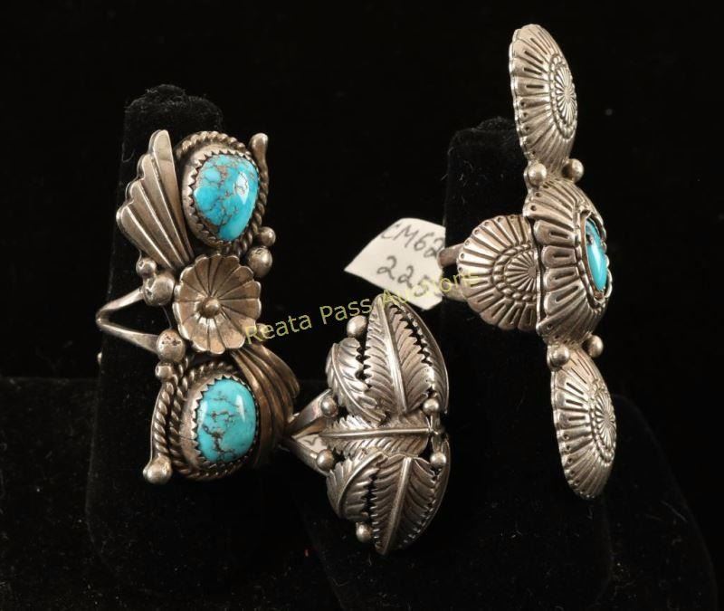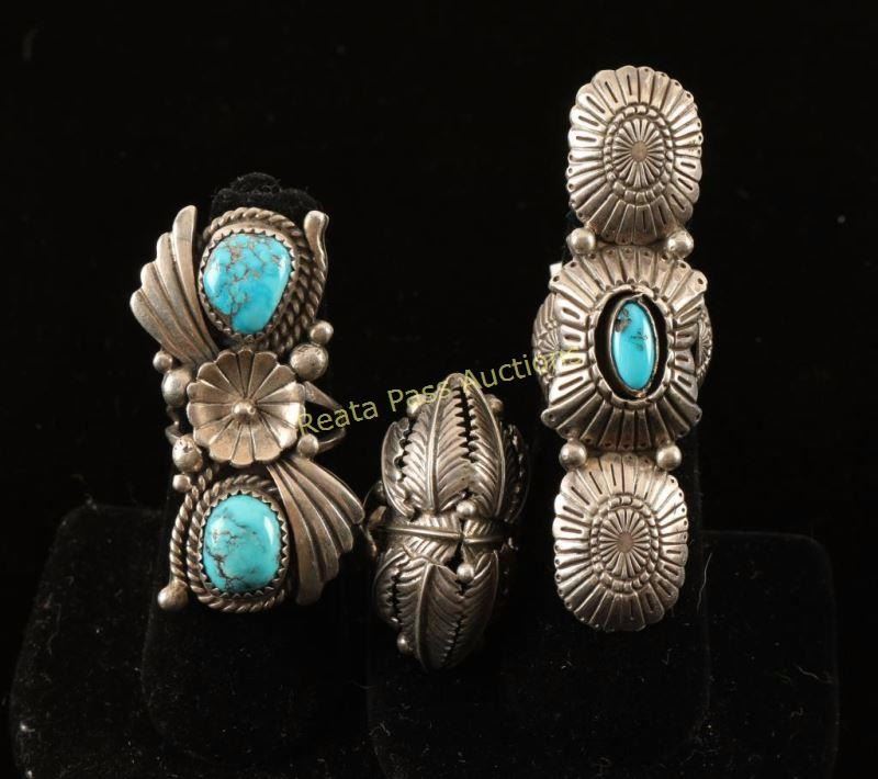 1 Sterling and turquoise ring with one upper and one lower stone with silver floral and leaf motif marked 'RB', 1 silver ring with leaf design marked 'RG Sterling', and 1 oblong silver engraved with inset turquoise stone marked "Sterling RTT"