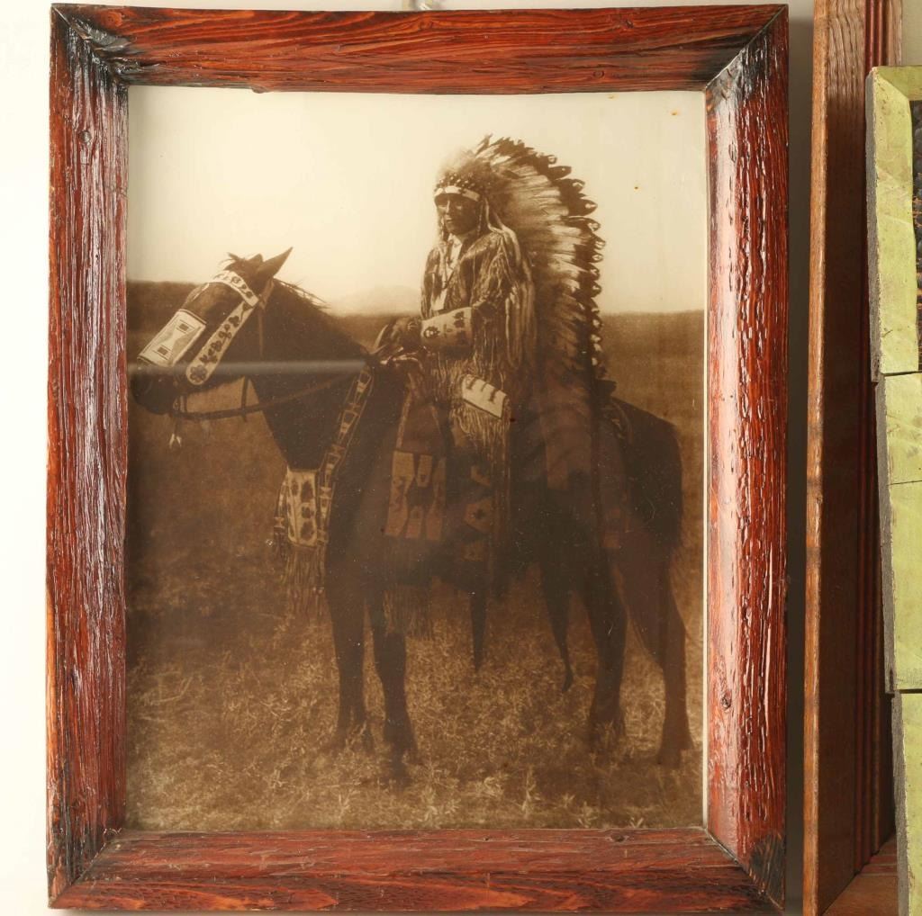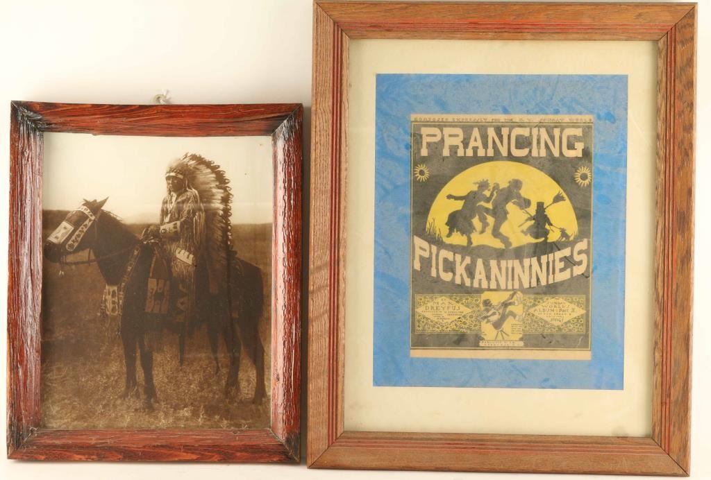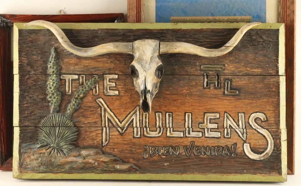 Includes (1) Framed reproduced image of an Indian Chief on horseback, image size 10 1/2" x 13", (1) framed and matted advertiser for the "Prancing Pickaninnies" by Max Dryfus, image size 8" x 11", and (1) wooden plaque that reads "The Mullens !Bein Venida!" with carved longhorn skull decoration and desert flora, measures 27" x 15 1/2".