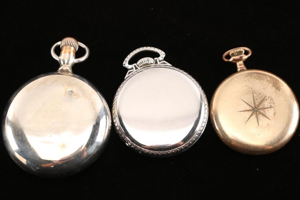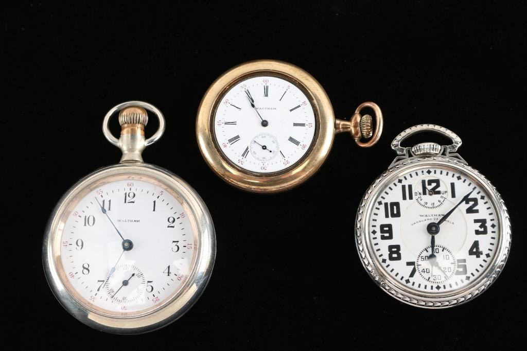 1) Waltham grade 820 model 1883, 18 size, 15 jewel. Number 9140965, manufactured 1899. Trade mark silver case. In good working order. 2) Waltham Vanguard grade model 1908, 16 size, 23 jewel. Number 26129508, manufactured 1908. Railroad grade. Waltham 14K gold filled case. In good working order. 3) Waltham Riverside grade model 1890, 6 size, 17 jewel. Number 6031271, estimated production 1897-99.. Attleboro 25 year gold filled case. In good working order but missing crystal.