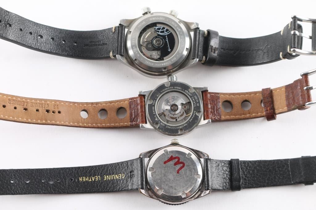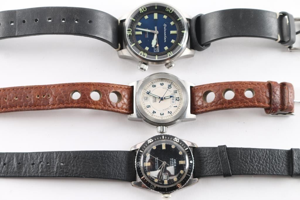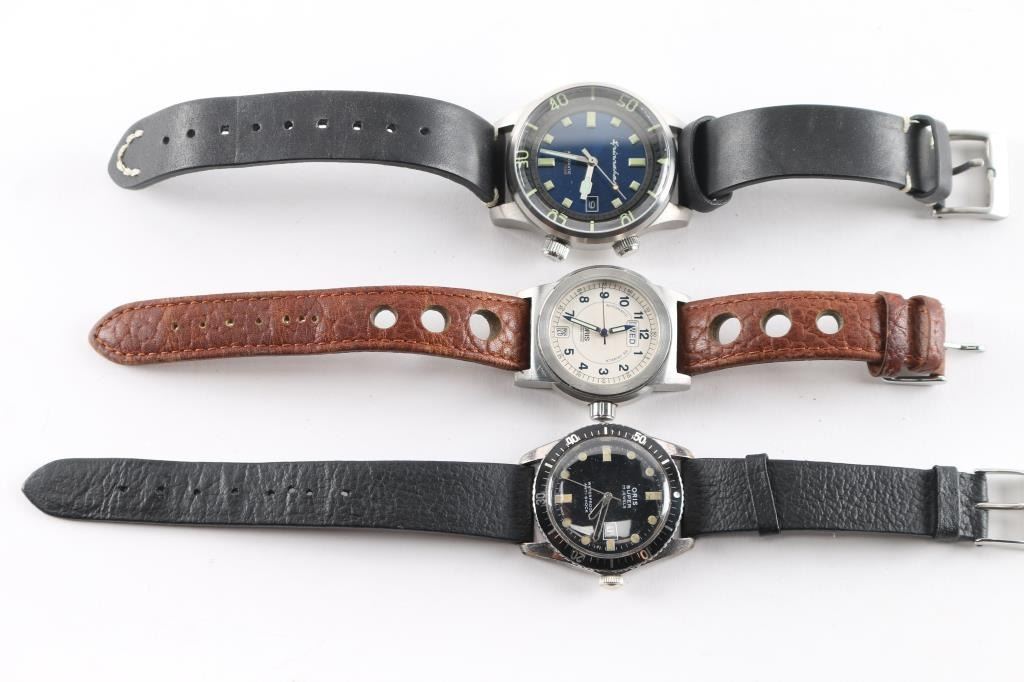 (1) Oris Super 17 Jewel waterproof watch black face stainless case with black leather band.