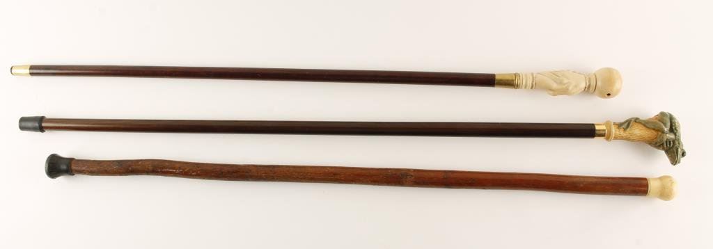 Lot of 3 antique canes, ca 1900 or earlier including a wood cane with ivory top knob, approximately 36” long; another wood cane approximately 36” long with a blonde wood carving handle of two hands shaking and a third wood cane approximately 38” long with a finely carved frog as the handle. Est.: $600-$1,200.