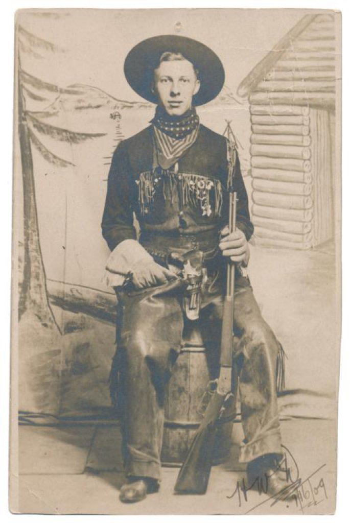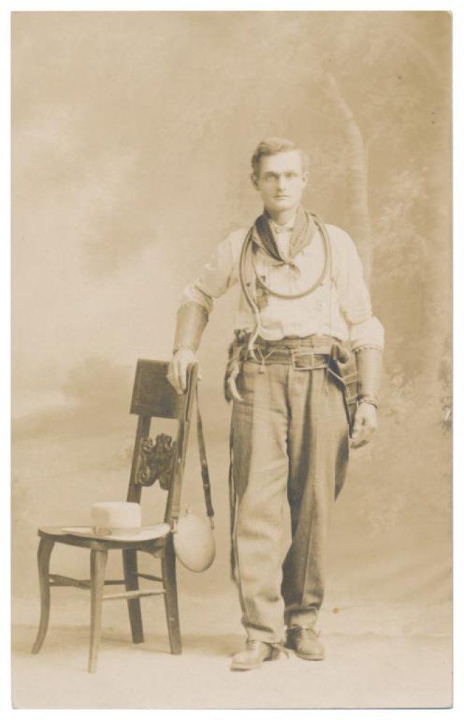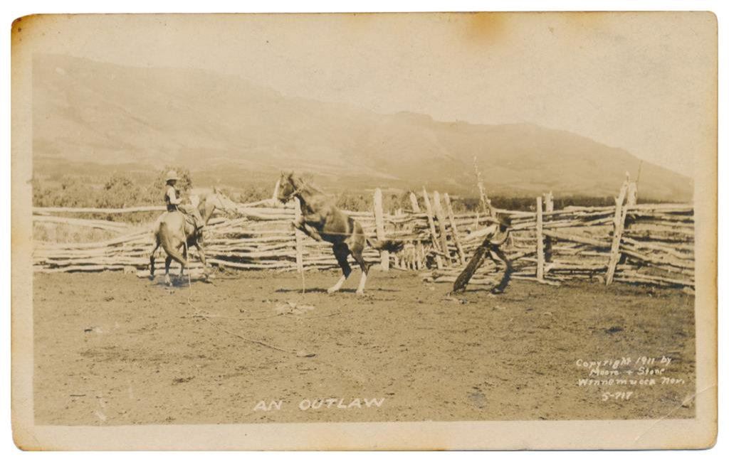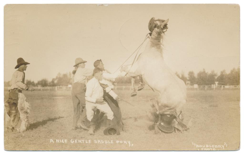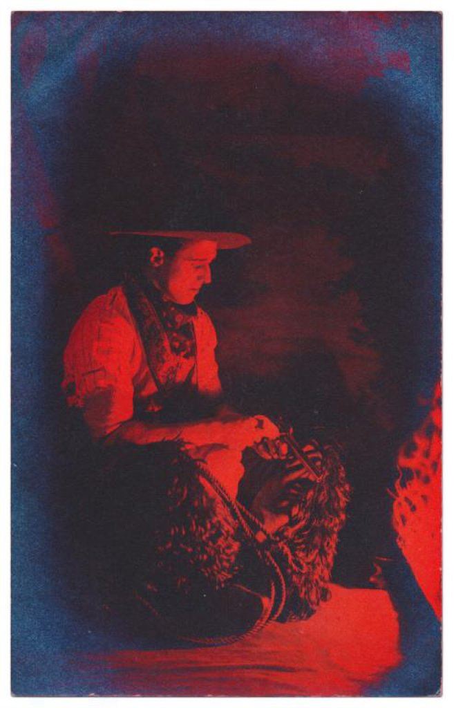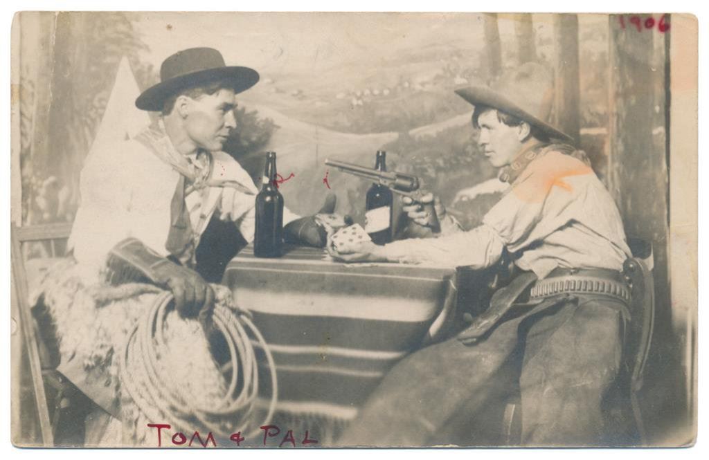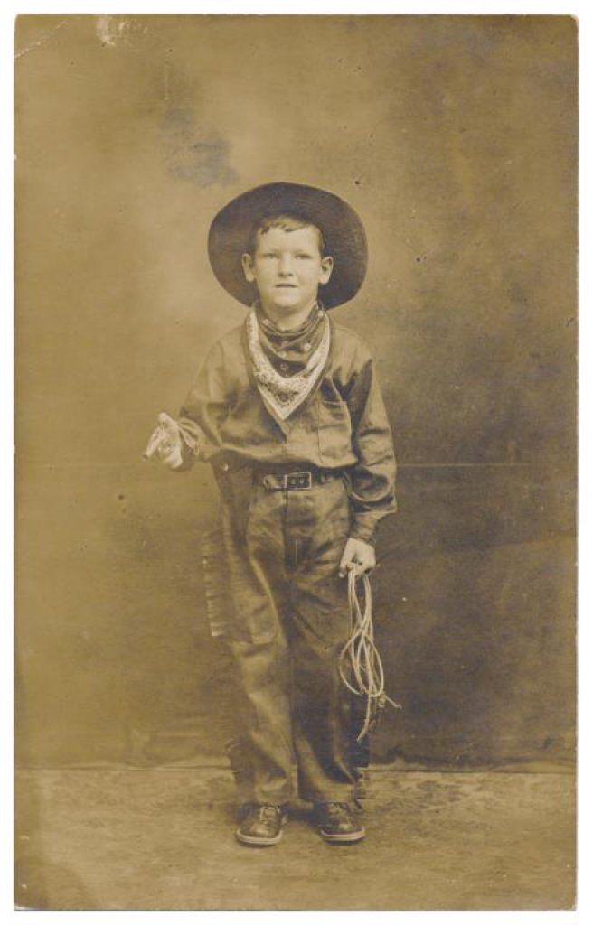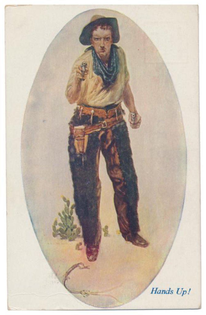 Lot of 31 early Western postcard photos including a tintype of a ranch hand or miner. This interesting lot has many card from the early 1900’s including round-ups, branding, bronco busting, bull dogging, two postcards of the Bacon Brothers, “World’s Longest Horseback Riders”, a great photo postcard of a youngster in cowboy outfit holding what appears to be a rubber band gun, dated Oct. 3, 1916 with the handwritten note “Hello Uncle Pete! I am Erhardt Bernard, Seven Years Old”. Also four staged photos of men in cowboy outfits holding guns including a Remington percussion Army revolver, possibly a Colt SAA with hard rubber eagle grips, a lever action Marlin rifle and possibly a S&W DA top break .44 revolver (or copy of same) and a Remington percussion revolver, a pocket size DA top break revolver and SxS shotgun. Also a street scene of early Tucson, AZ, an early photo postcard of Tom Mix and a later photo postcard of Gene Autry. A great varied lot of Western subject matter! Est.: $175-$275.