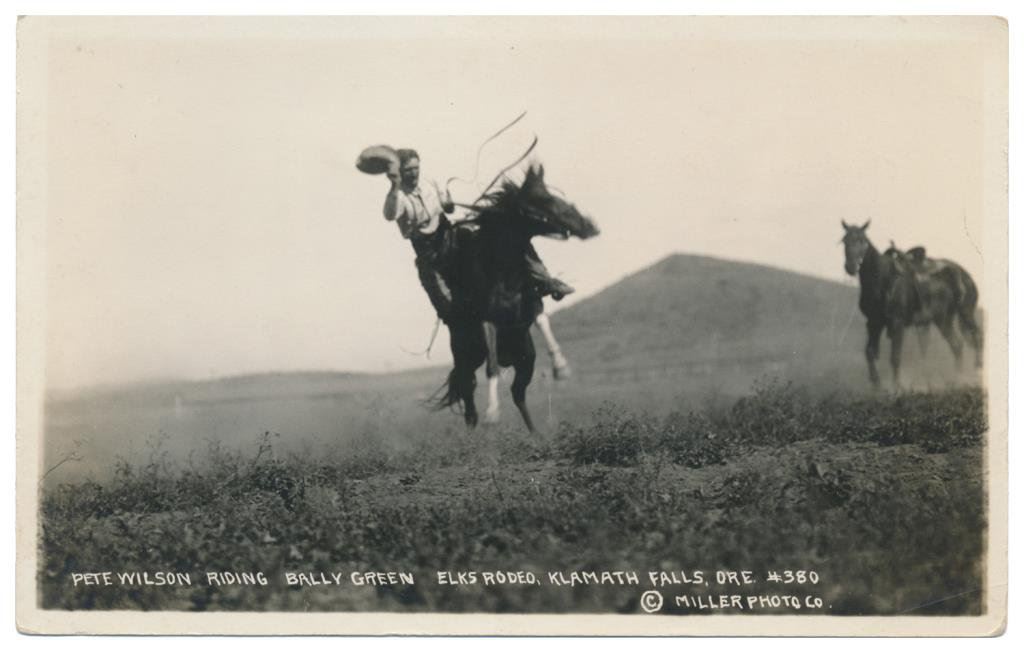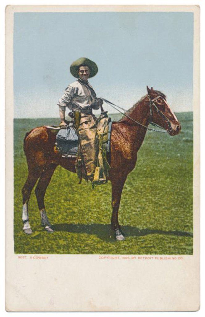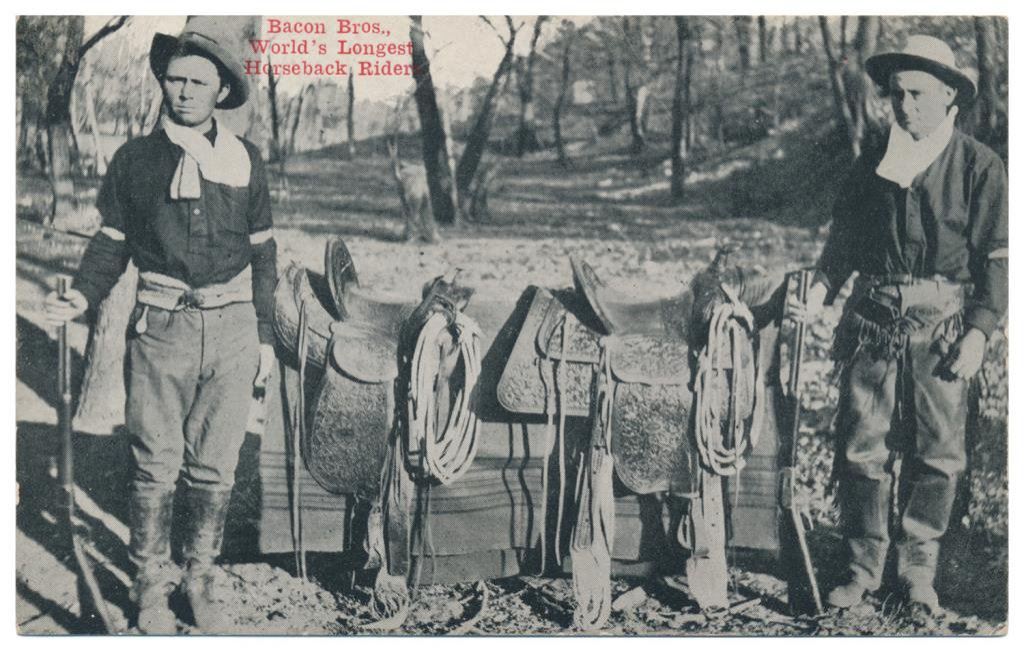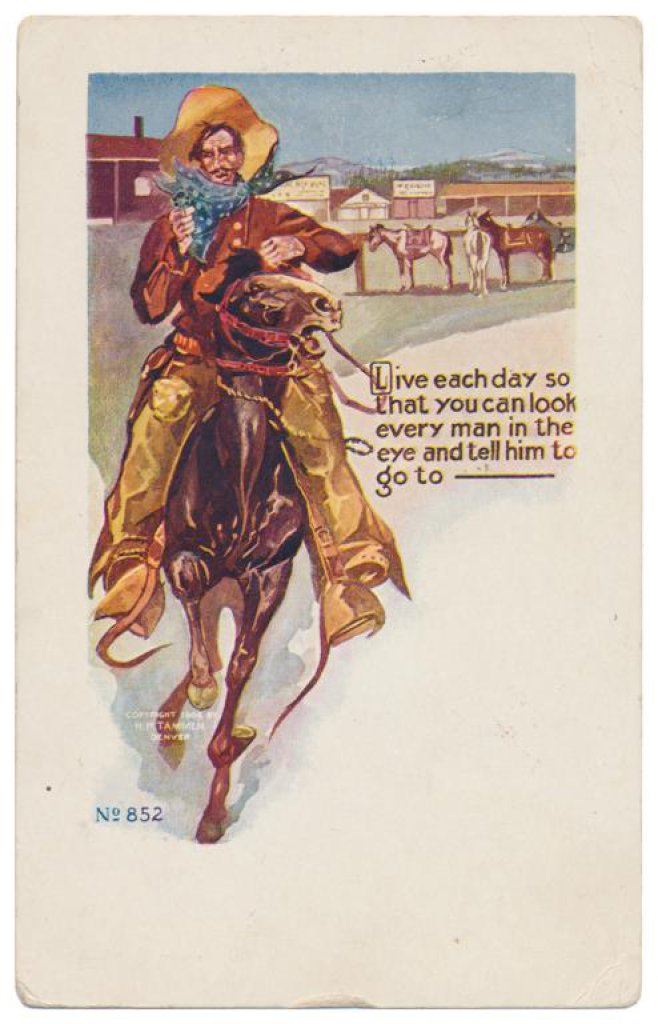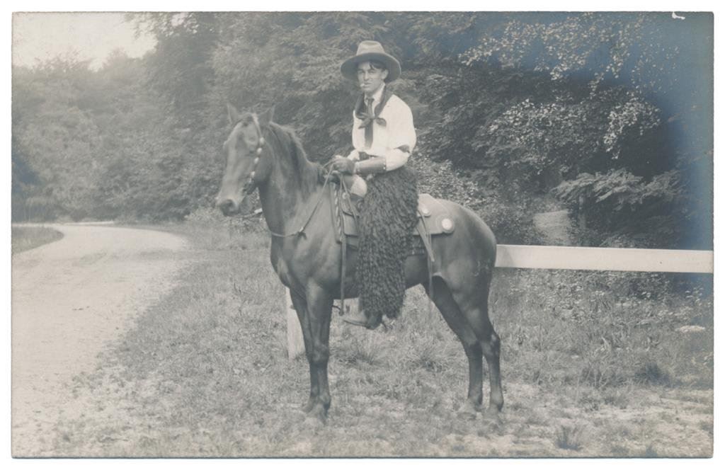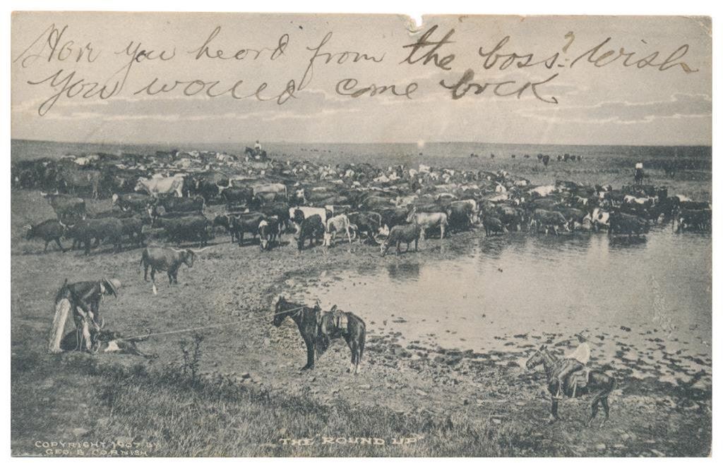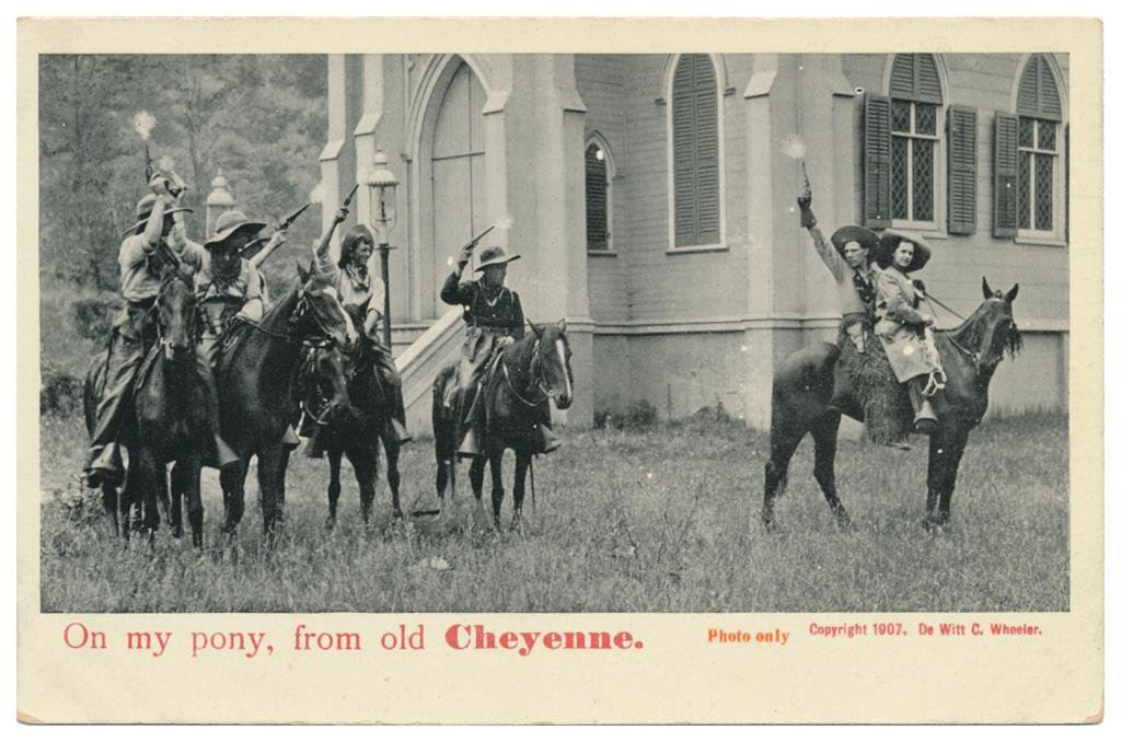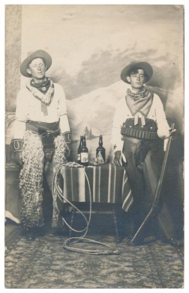 Lot of 31 early Western postcard photos including a tintype of a ranch hand or miner. This interesting lot has many card from the early 1900’s including round-ups, branding, bronco busting, bull dogging, two postcards of the Bacon Brothers, “World’s Longest Horseback Riders”, a great photo postcard of a youngster in cowboy outfit holding what appears to be a rubber band gun, dated Oct. 3, 1916 with the handwritten note “Hello Uncle Pete! I am Erhardt Bernard, Seven Years Old”. Also four staged photos of men in cowboy outfits holding guns including a Remington percussion Army revolver, possibly a Colt SAA with hard rubber eagle grips, a lever action Marlin rifle and possibly a S&W DA top break .44 revolver (or copy of same) and a Remington percussion revolver, a pocket size DA top break revolver and SxS shotgun. Also a street scene of early Tucson, AZ, an early photo postcard of Tom Mix and a later photo postcard of Gene Autry. A great varied lot of Western subject matter! Est.: $175-$275.