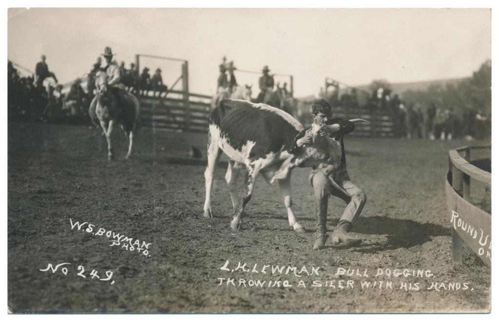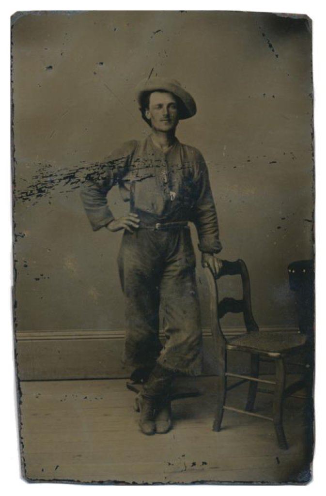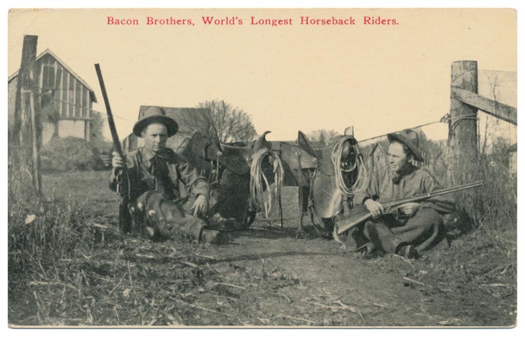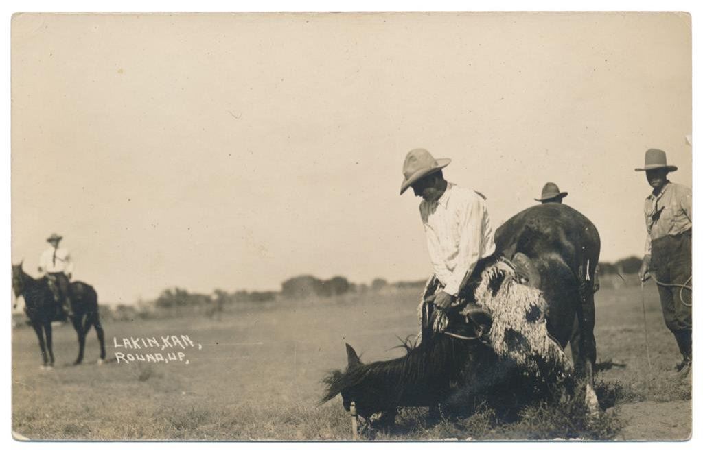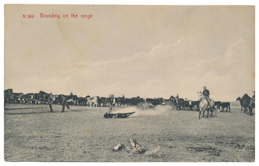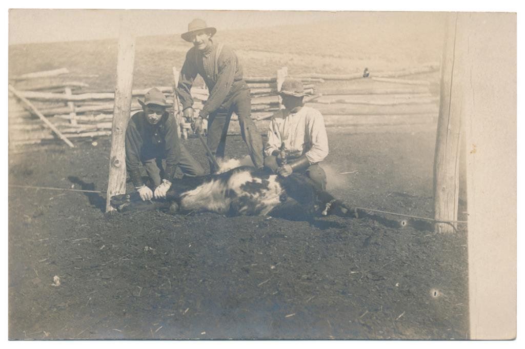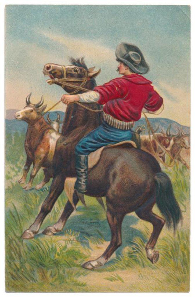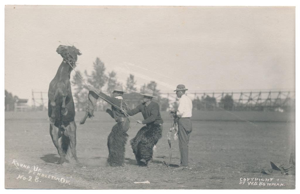 Lot of 31 early Western postcard photos including a tintype of a ranch hand or miner. This interesting lot has many card from the early 1900’s including round-ups, branding, bronco busting, bull dogging, two postcards of the Bacon Brothers, “World’s Longest Horseback Riders”, a great photo postcard of a youngster in cowboy outfit holding what appears to be a rubber band gun, dated Oct. 3, 1916 with the handwritten note “Hello Uncle Pete! I am Erhardt Bernard, Seven Years Old”. Also four staged photos of men in cowboy outfits holding guns including a Remington percussion Army revolver, possibly a Colt SAA with hard rubber eagle grips, a lever action Marlin rifle and possibly a S&W DA top break .44 revolver (or copy of same) and a Remington percussion revolver, a pocket size DA top break revolver and SxS shotgun. Also a street scene of early Tucson, AZ, an early photo postcard of Tom Mix and a later photo postcard of Gene Autry. A great varied lot of Western subject matter! Est.: $175-$275.