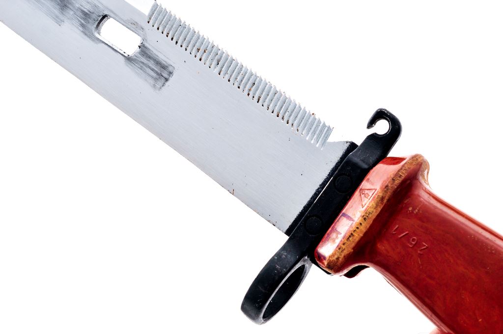 Lot of Four (4) AK-47 Bayonets of various vintages, and one Moisin-Nagant Bayonet. Group consists of: 1.) Black plastic grip AK bayonet with plastic scabbard having wire cutter tip, in like new condition. 2.) Black composite grip AK bayonet, with black composite scabbard, in very good condition. 3.) Black composite grip AK bayonet with metal scabbard, having wire cutter tip. Rubber sleeve near mouth of scabbard in good condition. 4.) Orange mottled plastic grip AK bayonet with orange composite scabbard, having wire cutter tip, in like new condition. 5.) Moison-Nagant bayonet with rough late-war milling type finish, in good condition. Est.: $150-$250/lot. (Joe Poyer collection)