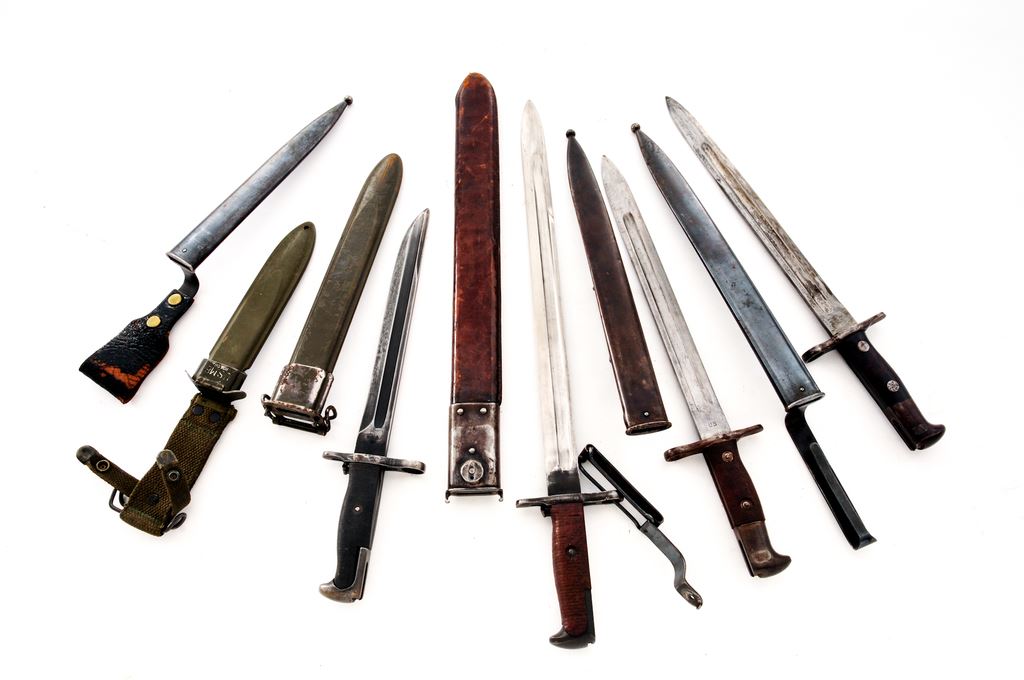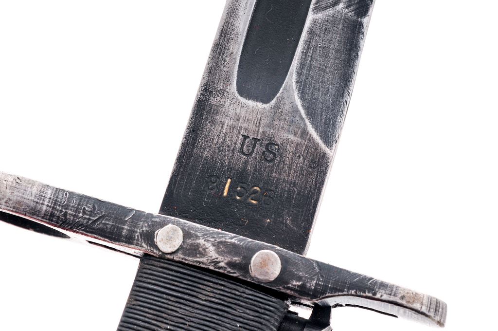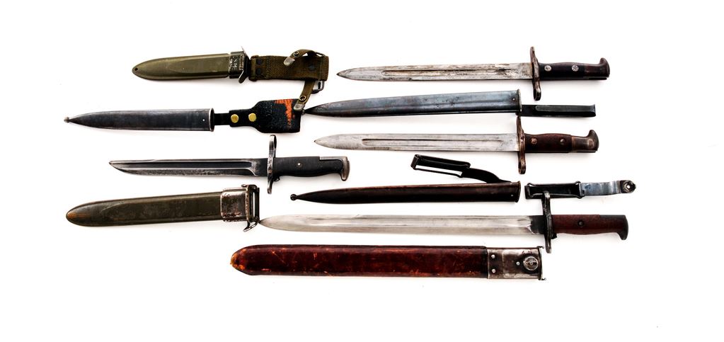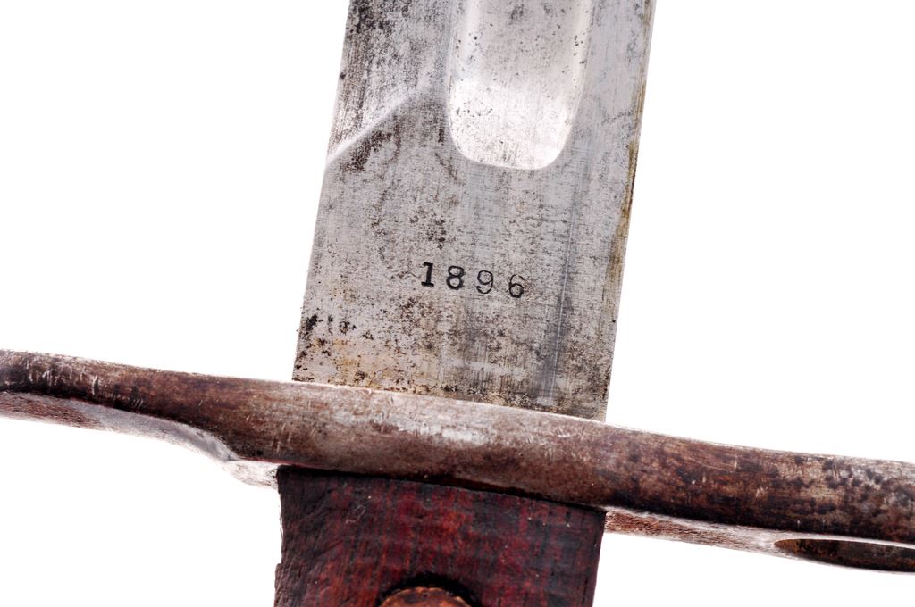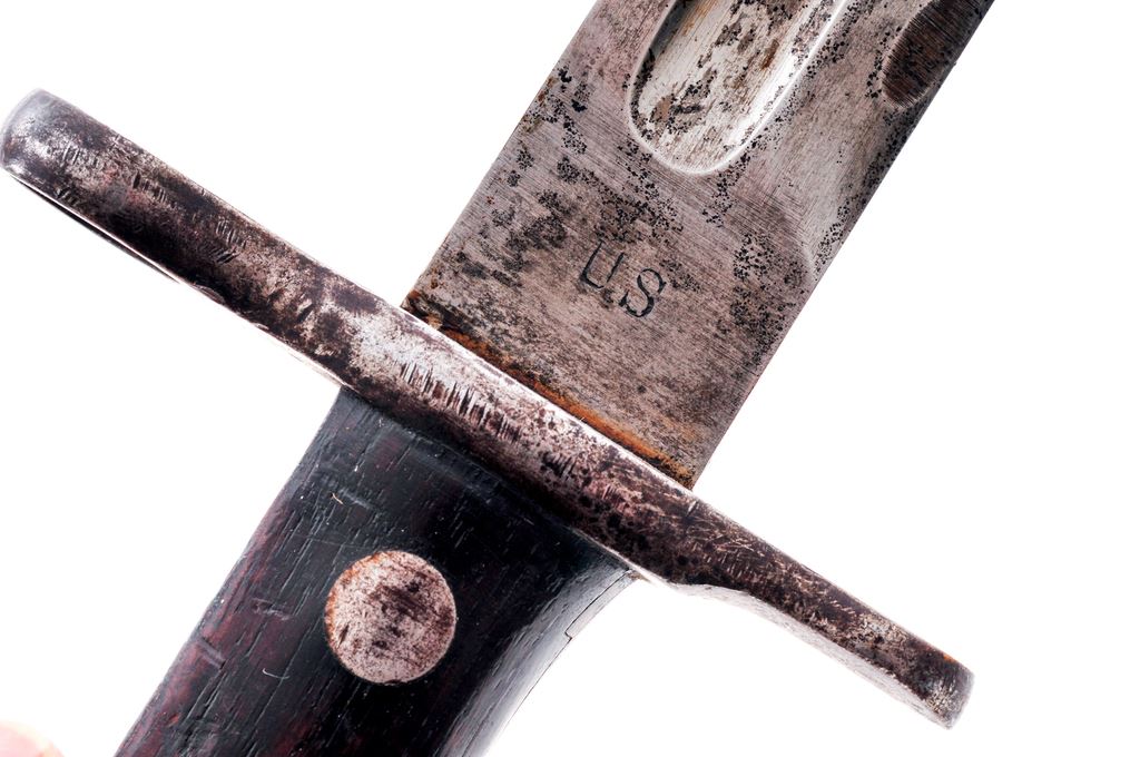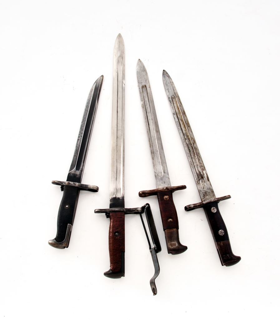 Lot of Four (4) Bayonets and Two (2) Scabbards, consisting of: 1.) Krag bayonet, dated 1896, with scabbard having the early open loop type hanger. Blade shows grinding marks and light pitting. Blued scabbard is in good condition. 2.) Springfield bayonet by S.A., dated 1909, with nice bright blade. Parkerized finish on last inch of blade and on hilt. Nice wood grip panels. Scuffed leather scabbard with detached hanger present. 3.) Krag bayonet, dated 1896, with nice blade. Scabbard with standard type hanger in fair condition. 4. U.S. Springfield bayonet by RIA dated 1907, cut down for WWII use on the Garand. Blade measures 9.5'' with a clip point and in good condition. Scabbard is the WWII fiberglass type. 5.) Loose scabbard resembling a Krag type, but shorter, measuring 9.5'' long. Leather belt loop attached to swivel metal hanger. In good condition. 6. Loose WWII U.S. M8 sheath for the M1 carbine bayonet, in fair condition. Est.: $300-$600/lot. (Joe Poyer collection)
