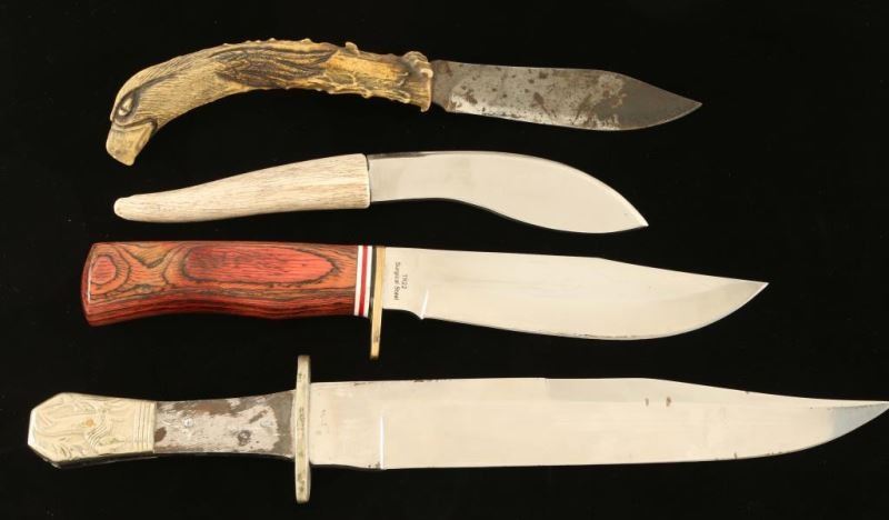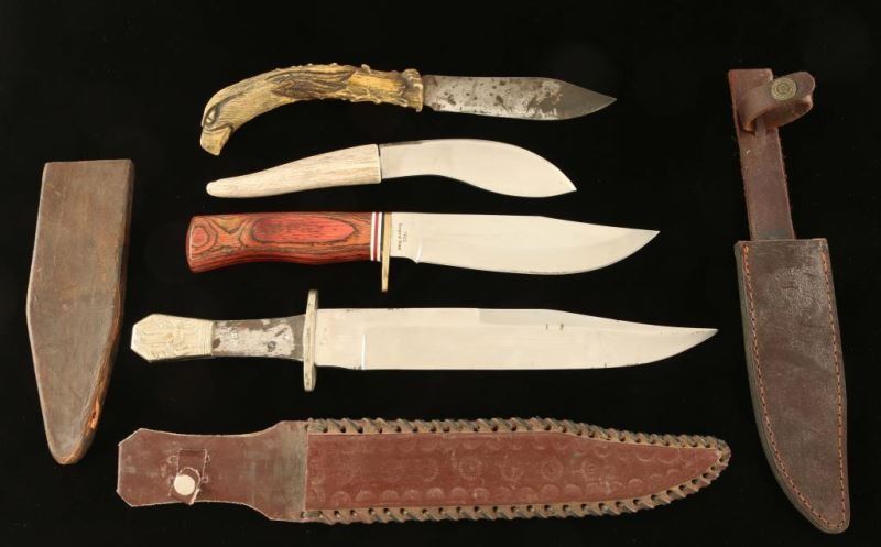 Faux antler handled knife, faux bone handled bowie knife with silver molded horse motif end in leather sheath, small faux ivory handle knife in leather sheath, and wood handled Sabre bowie knife marked 'Sabre Original Bowie Knife' with leather sheath.