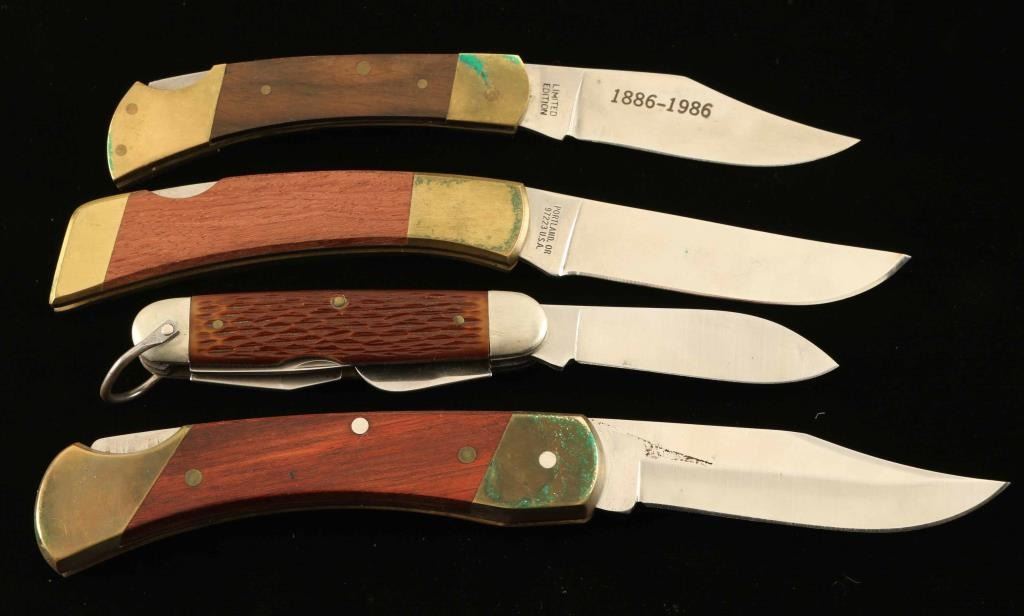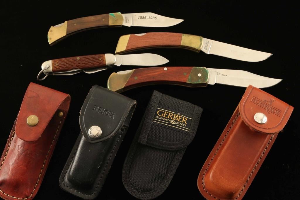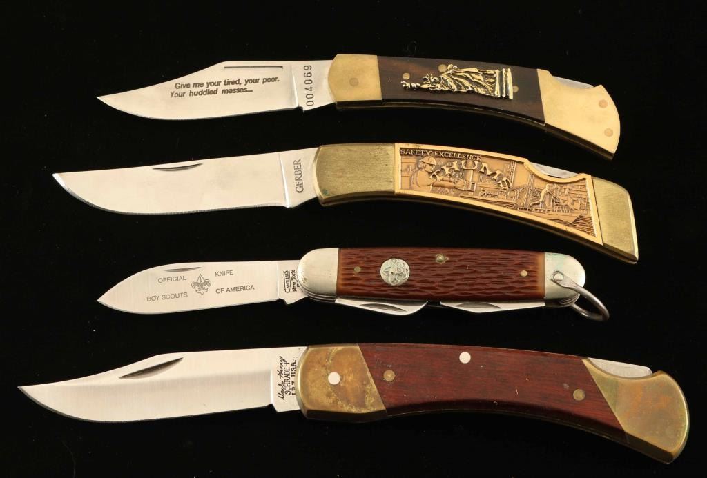 Includes (1) Gerber marked knife with decorated handle depicting a boat, factory scene, and worker and reads "Safety Excellence", measures 7 3/4" overall with a 3" blade, comes in Gerber nylon holder, (1) "Uncle Henry" Schrade knife in leather Schrade marked holster. 8 3/4" overall with 3 3/4" blade, (1) Boy Scouts of America Knife marked on the blade, measures 6 1/4" with 2 3/4" blade, and (1) Statue Of Liberty Buck knife marked on the blade "Give me your tired, your poor. Your huddled masses..." and has a depiction of the Statue of Liberty on the handle, measures 7" overall with 3 1/8" blade. All in very good to excellent condition.