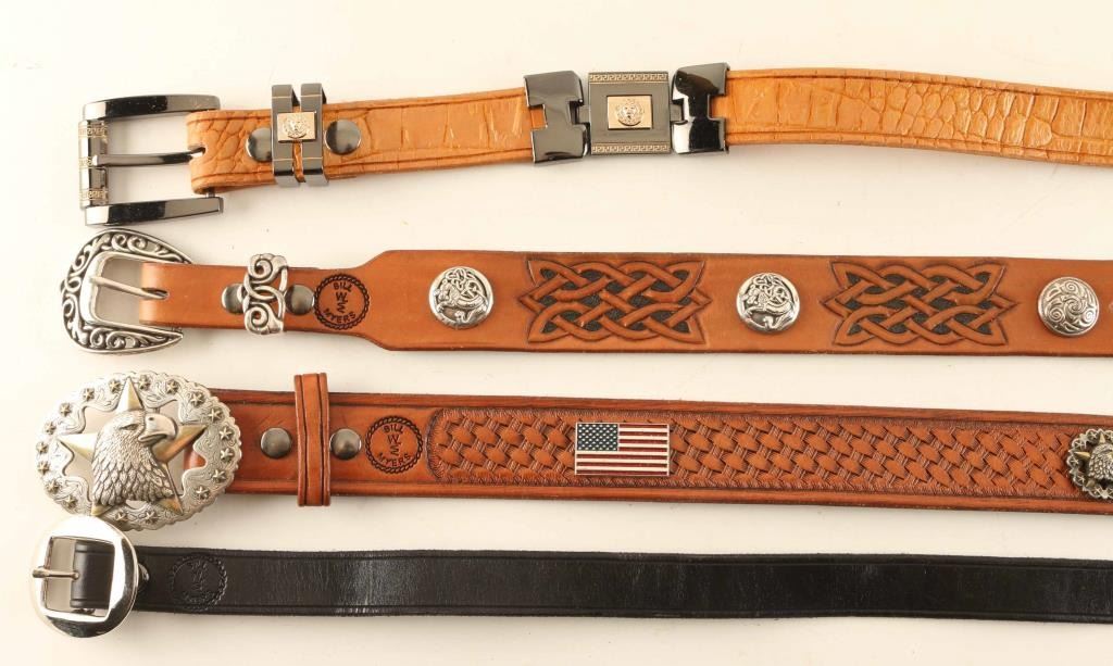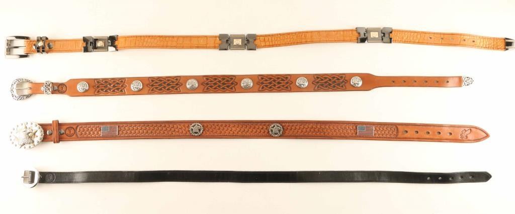 Includes (1) 36" waist belt with 9 conchos, (1) 36" waist belt with eagle belt buckle and decorated with eagle and flag conchos, (1) 41" waist 6-Piece buckle belt with gator pattern, and (1) 38" waist plain black belt with plain buckle. All items are genuine leather from Arizona leathersmith Bill Myers.
