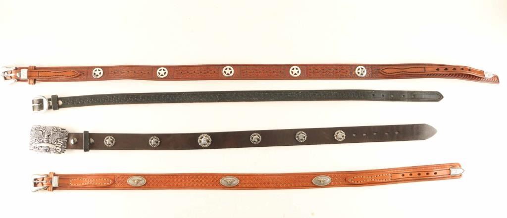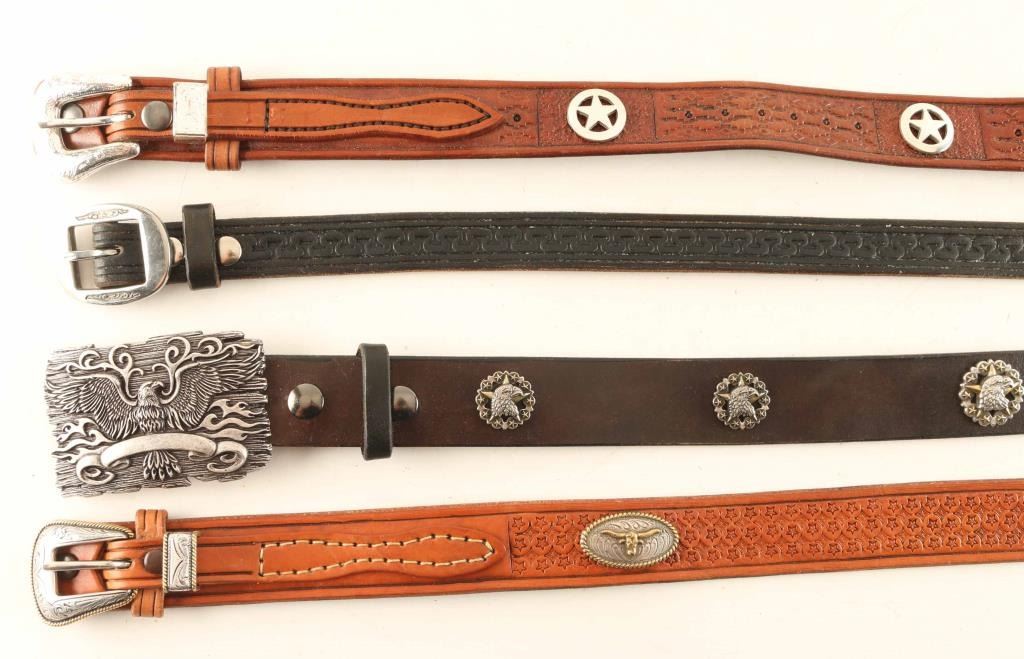 Includes (1) 31" waist black belt belt with eagle buckle and conchos, (1) 33" waist black belt with plain buckle, (1) 41" waist ranger belt with star conchos, and (1) 34" ranger belt with three longhorn conchos. All items are genuine leather from Arizona leathersmith Bill Myers.