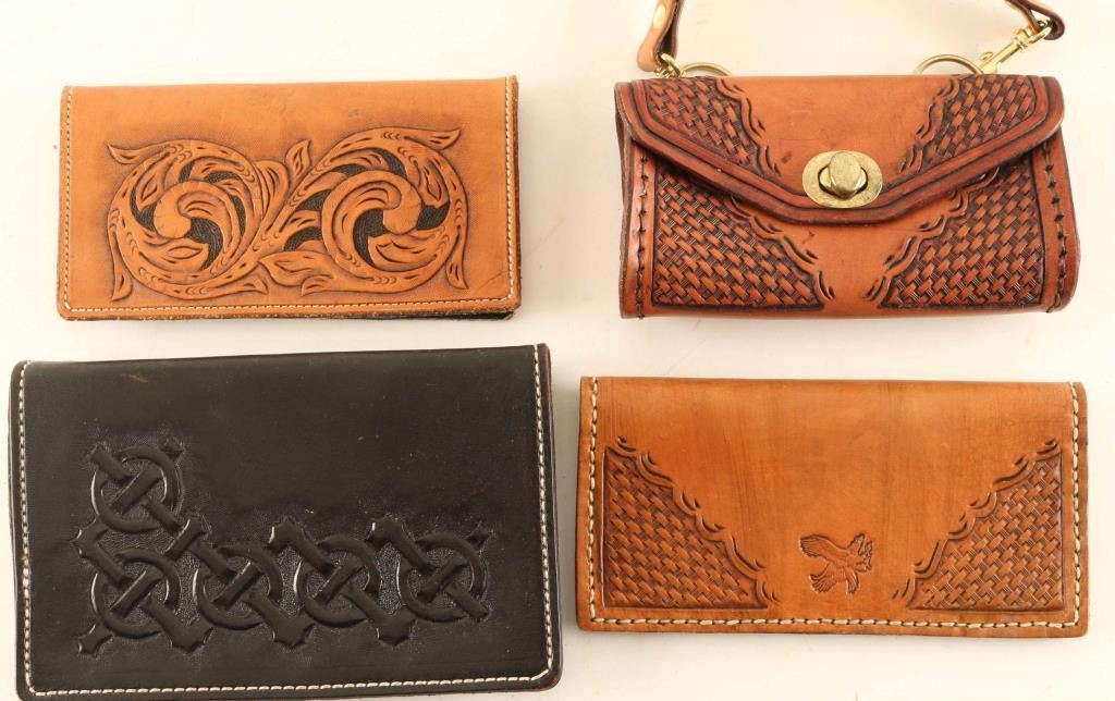 Includes (2) Leather checkbook wallets, (1) leather note book, and (1) leather shoulder purse. From Arizona Leathersmith Bill Myers, all genuine leather.