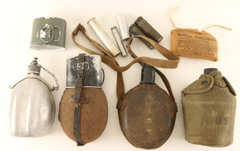 German third Reich MMK marked canteen, Japanese WWII Canteen with strap, US 1943 marked canteen with cover and cup, European aluminum canteen. German canteen cip and 1940's British battle dressing, and cleaning kits, German 1943 dated empty flare.