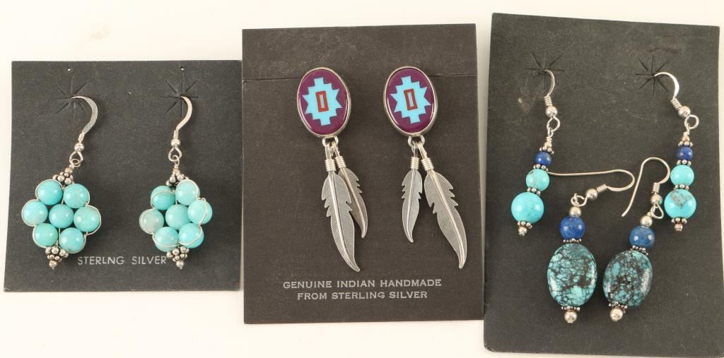 1 Oval With Turquoise And Purple Geometric Design With Feather Dangles, 2 Pair Turquoise Dangles, And 1 Blue Round Bead Dangle In Floral Pattern.