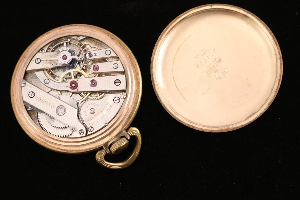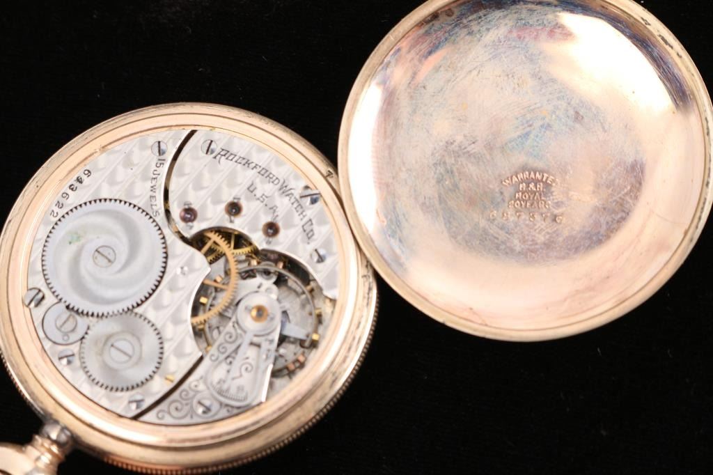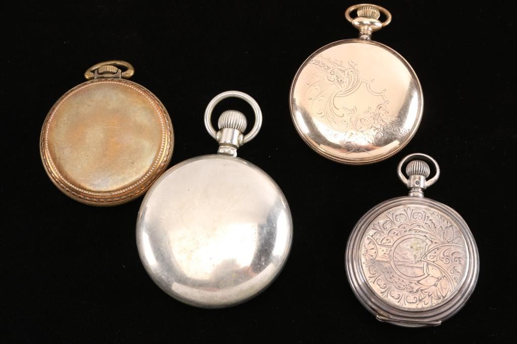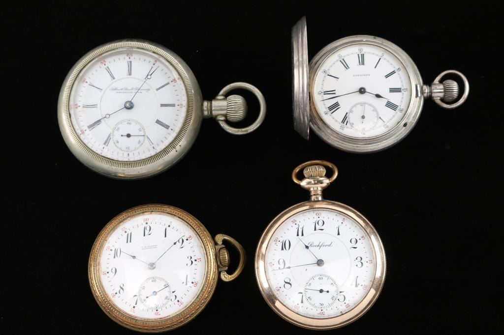 1) Longines 19 Ligne, 15 jewel. Swiss made. Movement marked "Gold Medal Paris 1878". Movement cover marked with 9 medals, "Anvers 1885, Paris 1878" etc. Inside front cover is a paper full color portrait of a young lady. Longines 0.800 silver tiered hunting case. In good working order, 2) Illinois grade 61 model 518 size,17 jewel. Number 1414423, manufactured 1898. Private label "Schmidt Bros, Waterloo Iowa" on dial. Philadelphia silverode case, Crown & Stem at 3 o'clock. In good working order. 3) Rockford grade 587 model 2, 16 size, 15 jewel. Number 643622, manufactured 1904. B&B Royal 20 year gold filled case. In good working order. 4) Dial and movement marked "W.D. Tusten. Houston Tex. Otherwise unmarked. Movement number 105035. 16 size. Emperor base metal case. In good working order