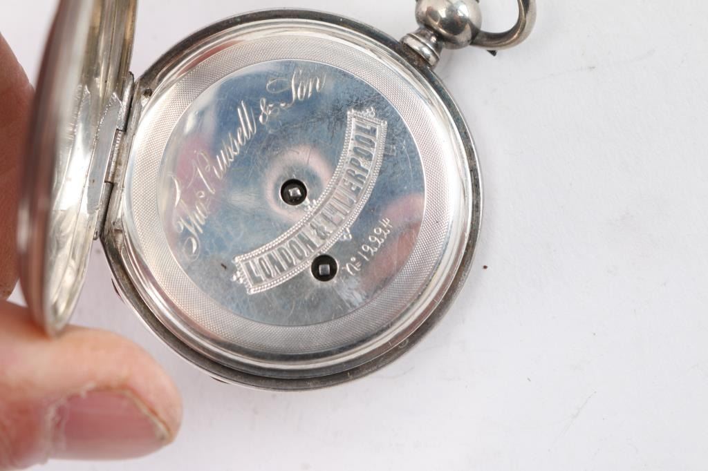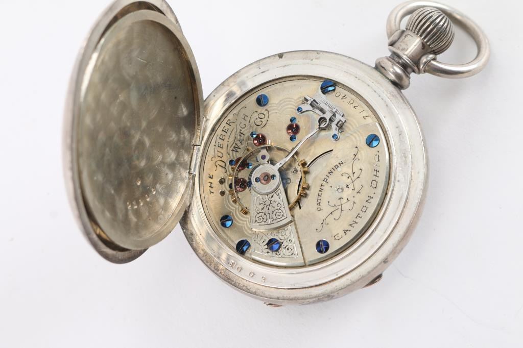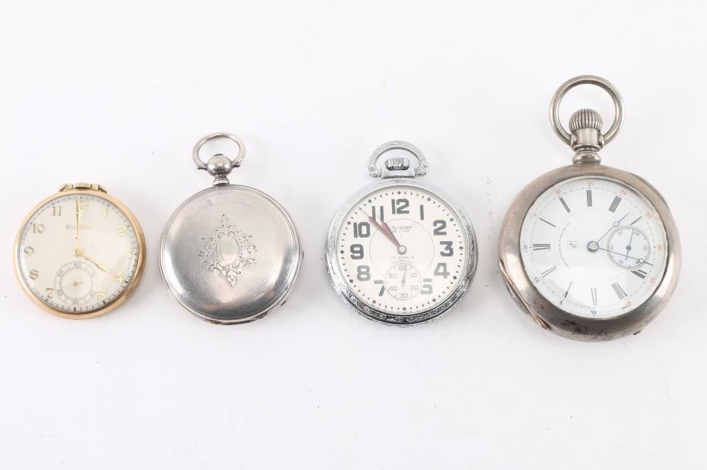 1) Thomas Russel & Son, London & Liverpool marked dial. Key wind Swiss import movement number 12224. Silver hunting case. Unknown if running. Missing key & crystal. 2) Bulova grade 17, AH Movement. Gold filled case. In good working order. 3) avalon Deluxe. Swiss made. 17 jewel. Base metal case. In good working order. 4) Dueber Watch Co. Model 2. (Hampden)18 size, 15 jewel. Number 717040, manufactured 1891 Crown/stem at 3 o'clock. Fahy's Monarch coin/silver case. In good working order.