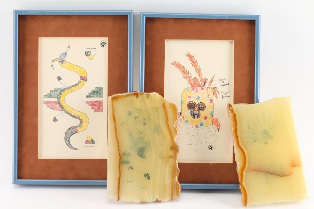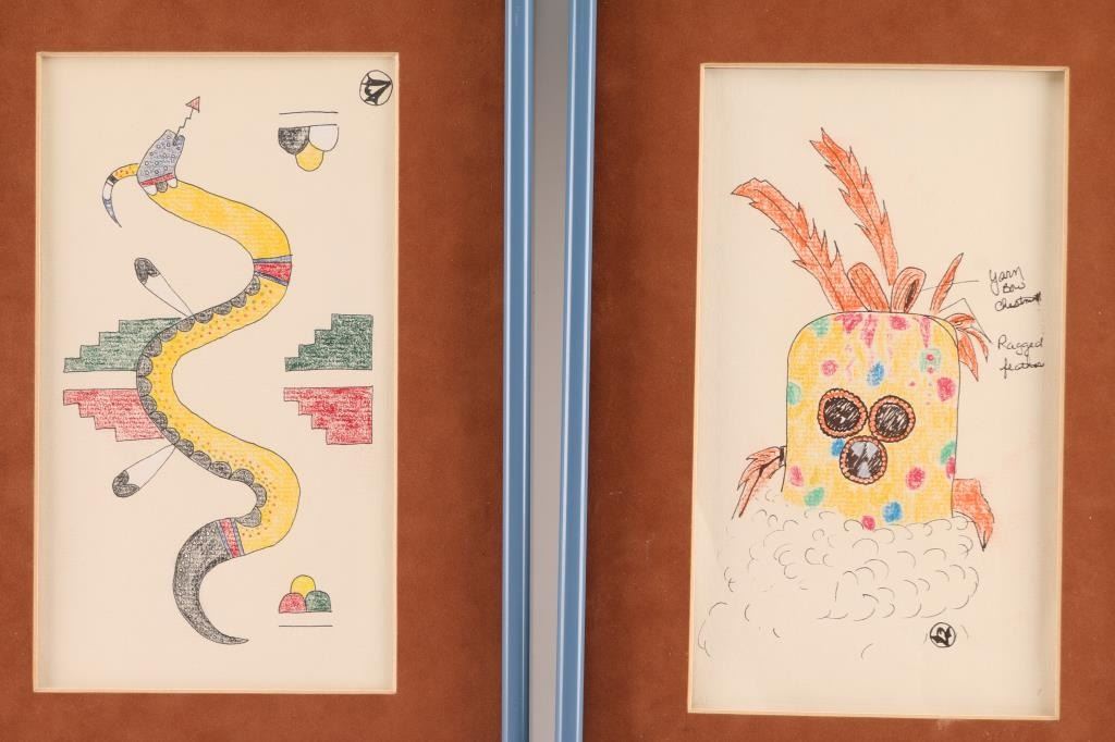(2) Colored pencil drawings, signed, of kachina dancer mask and a snake. Matted in brown leather, no glass in frames. Drawings measure 5"x9".