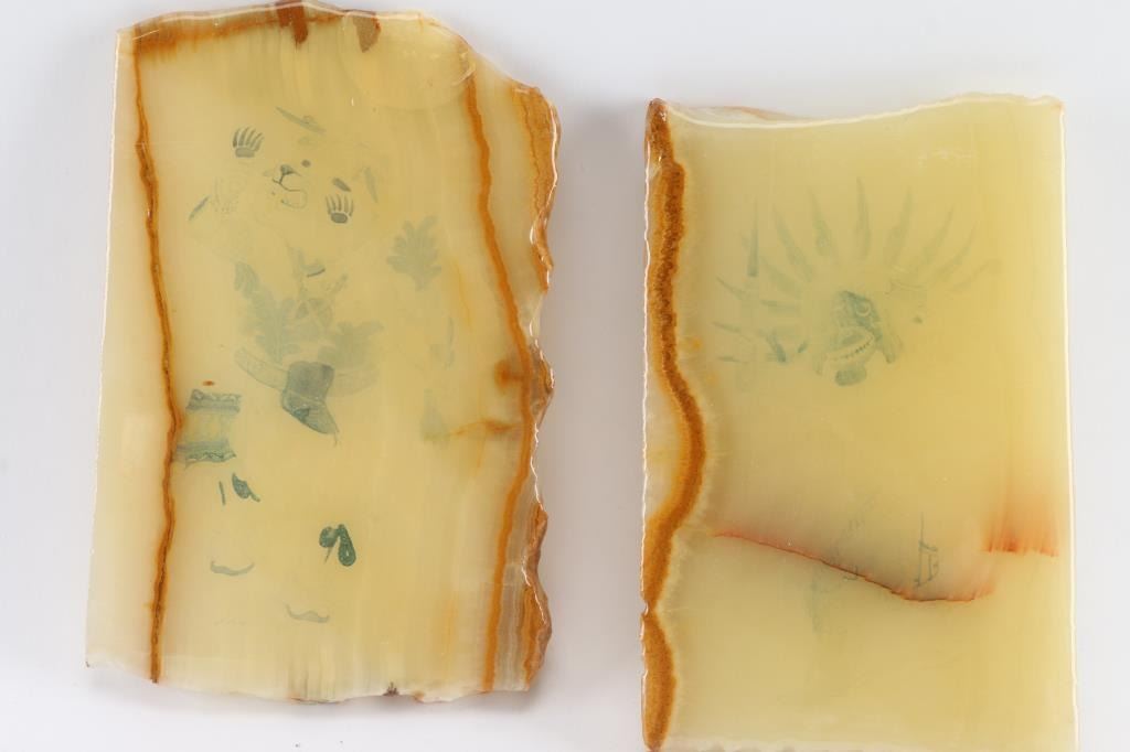 (2) Lacquered pieces of quartz, with native american symbols stamped onto front, ready for hanging on a wall. Measure 8" x 5".