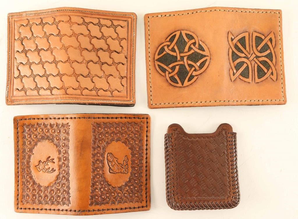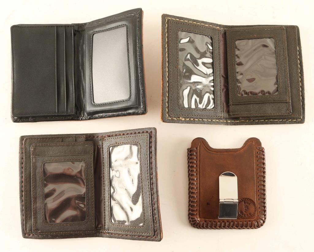 Includes (3) ID wallets, and (1) Money clip with card holder. From Arizona Leathersmith Bill Myers, all genuine leather.