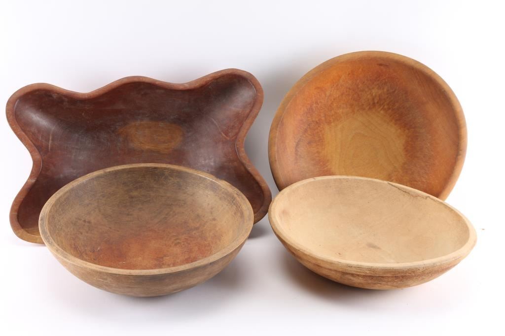One bowl measuring 12" diameter and 3 1/4" tall; one bowl measures 13" diameter and 3 1/2" tall; one measures 13" diameter by 3 3/4" tall; and one is shaped in a wiggly pattern measuring 16" long by 4" tall by 10" wide. All show some to quite a lot of wear or use inside..