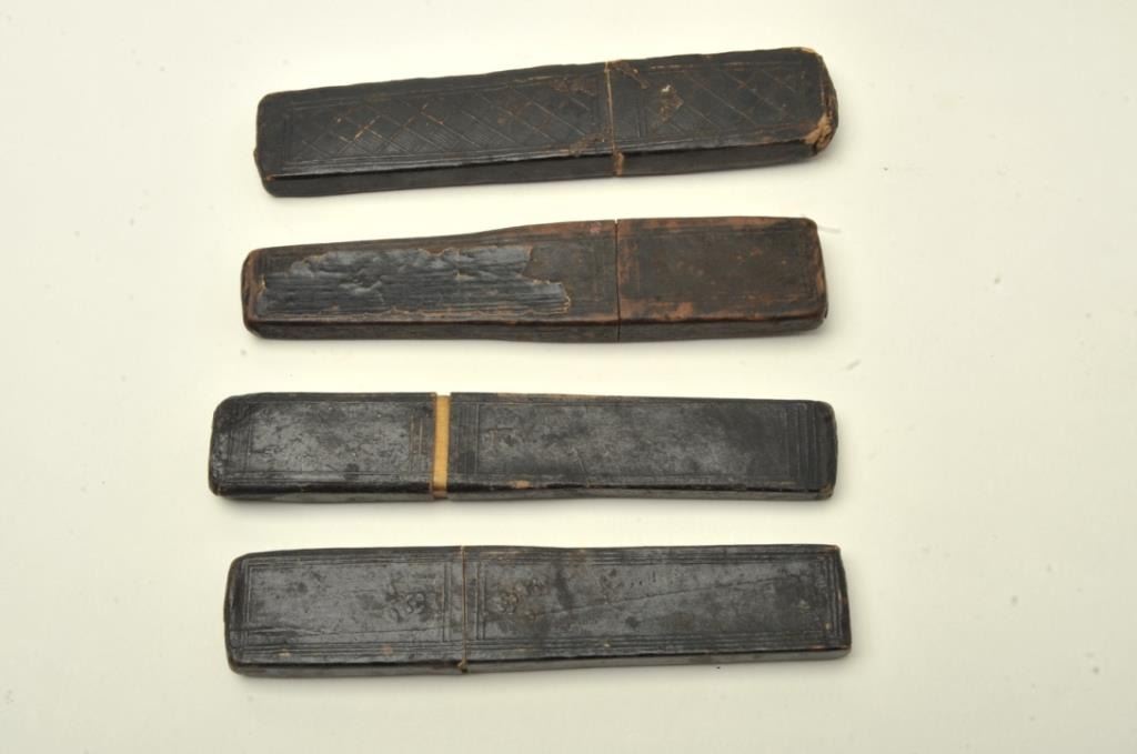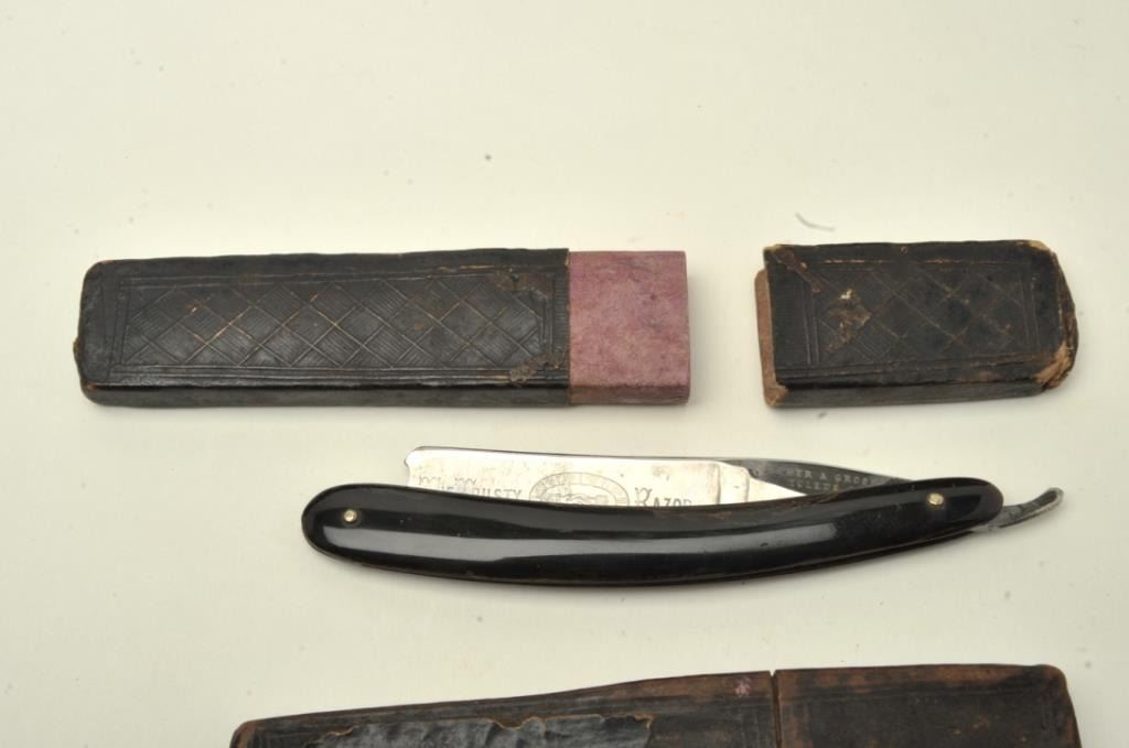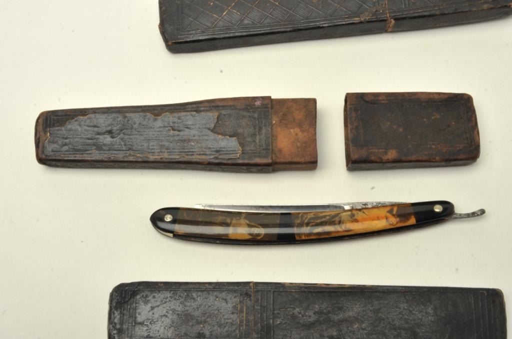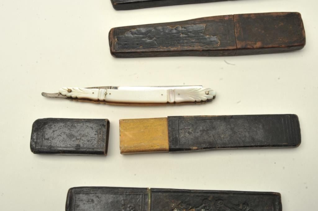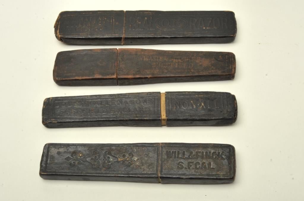 sleeves; one marked “The Trusty Razor” by Maher & Grosh, Toldeo, O.; one marked “Fox Cutlery Co., Solingen, Germany with erotic female figures in the grip; one marked “Made for Will & Finck Co” and in a Will & Finck/S.F. CAL-marked sleeve, plus one marked “Marshall Wells with pearl grips. Est.: $75-$125.